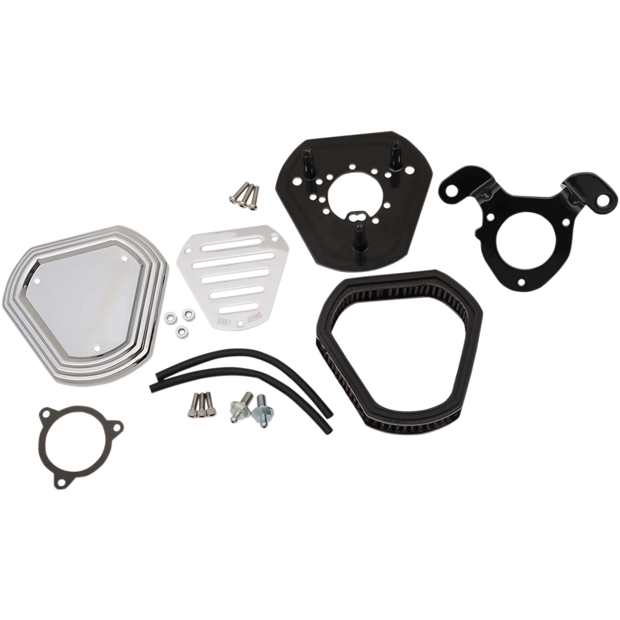 The HEX air cleaner is made from strong, stamped steel and finished in a textured black powder-coat or chrome finish. They come standard with the “Slotted” faceplate design and a K&N air filter installed for maximum performance and filtration. The air cleaner features oil breather bolts that route heat and chemical resistant, flexible tubing through the unit and back to the intake manifold for minimal oil seep.
