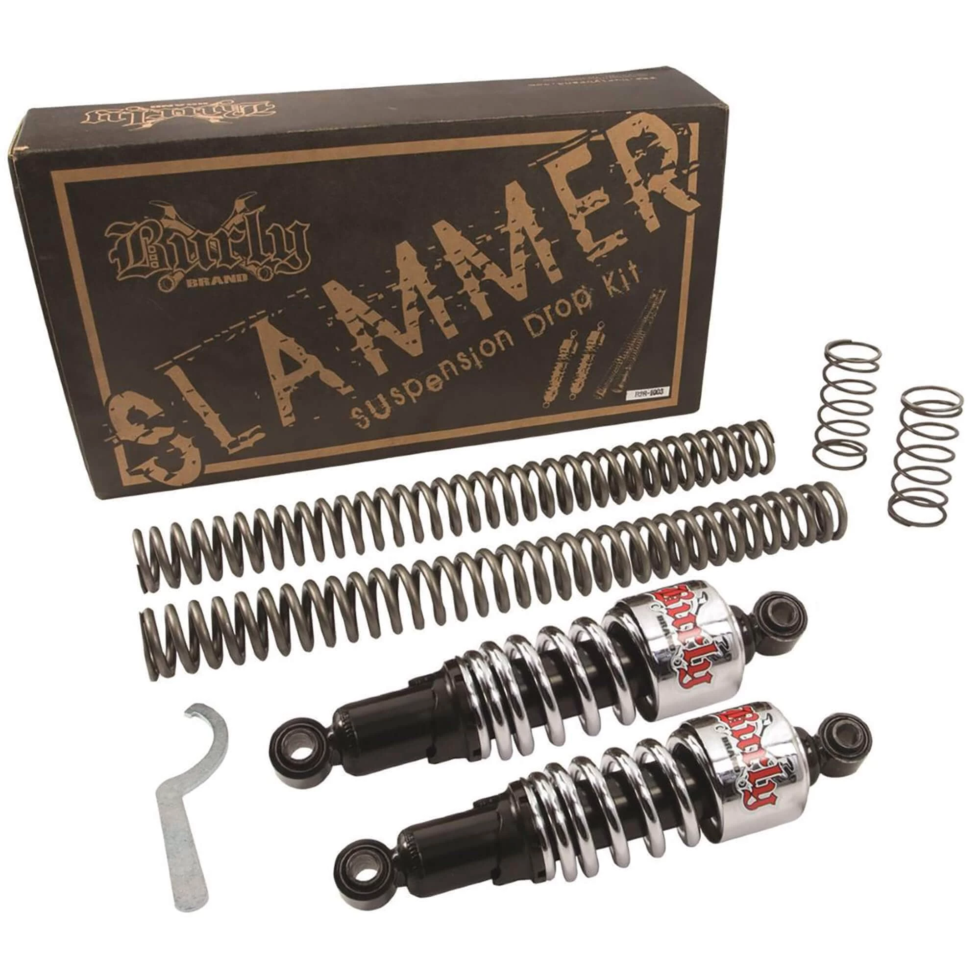 Dropped fork springs and stubby shocks in one easy to install and price-friendly kit. The Slammer Kit does not require disassembly of the forks and can be installed with the front end still on the bike on most models! The entire Slammer kit is set up to go from box to bike in under an hour with just basic tools on Sportsters and Dynas! See Additional Information below for fitment.