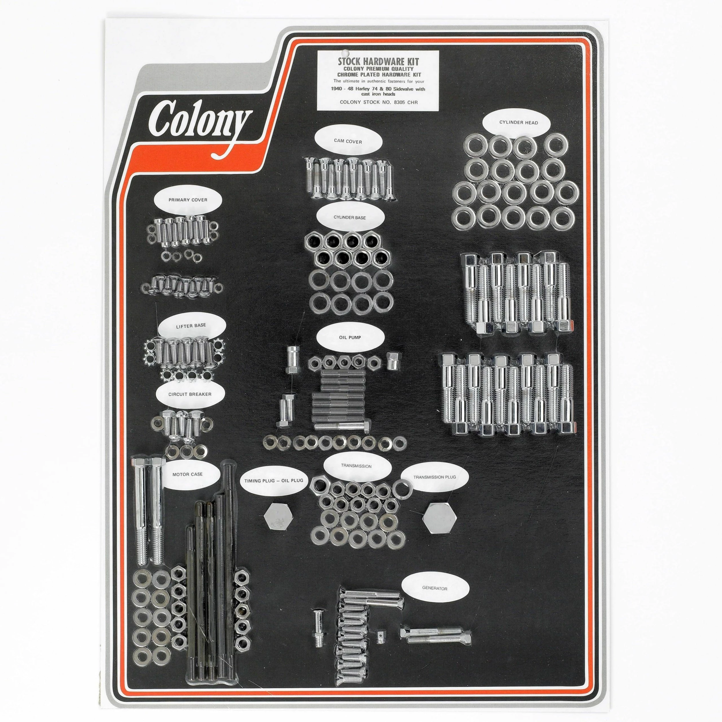 Complete stock hardware kit for Harley-Davidson 74 & 80 Side Valve with cast iron heads 1940 – 1948, chrome plated. Each kit contains all the stock motor nuts, bolts, washers and studs for your motor. The kit includes primary cover screws, lifter base screws, circuit breaker screws, case studs and nuts, timing plug, cam cover screws, cylinder base nuts and washers, oil pump nuts and bolts, transmission side cover nuts and washers, transmission top screws, transmission fill plug, generator screws, head bolts and washers. All hardware meets or exceeds original Harley specifications. By Colony Machine. 100% Made In America. Part #8305 CHR