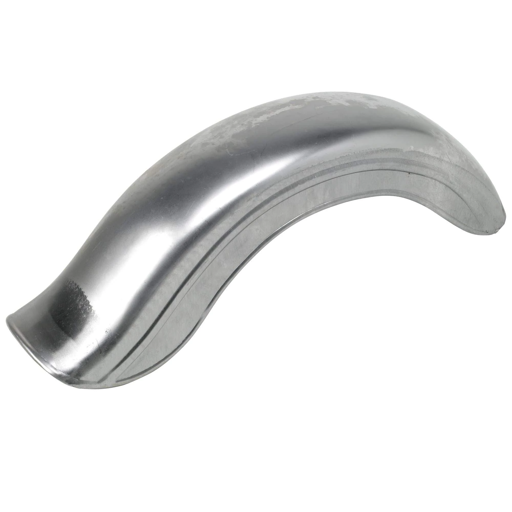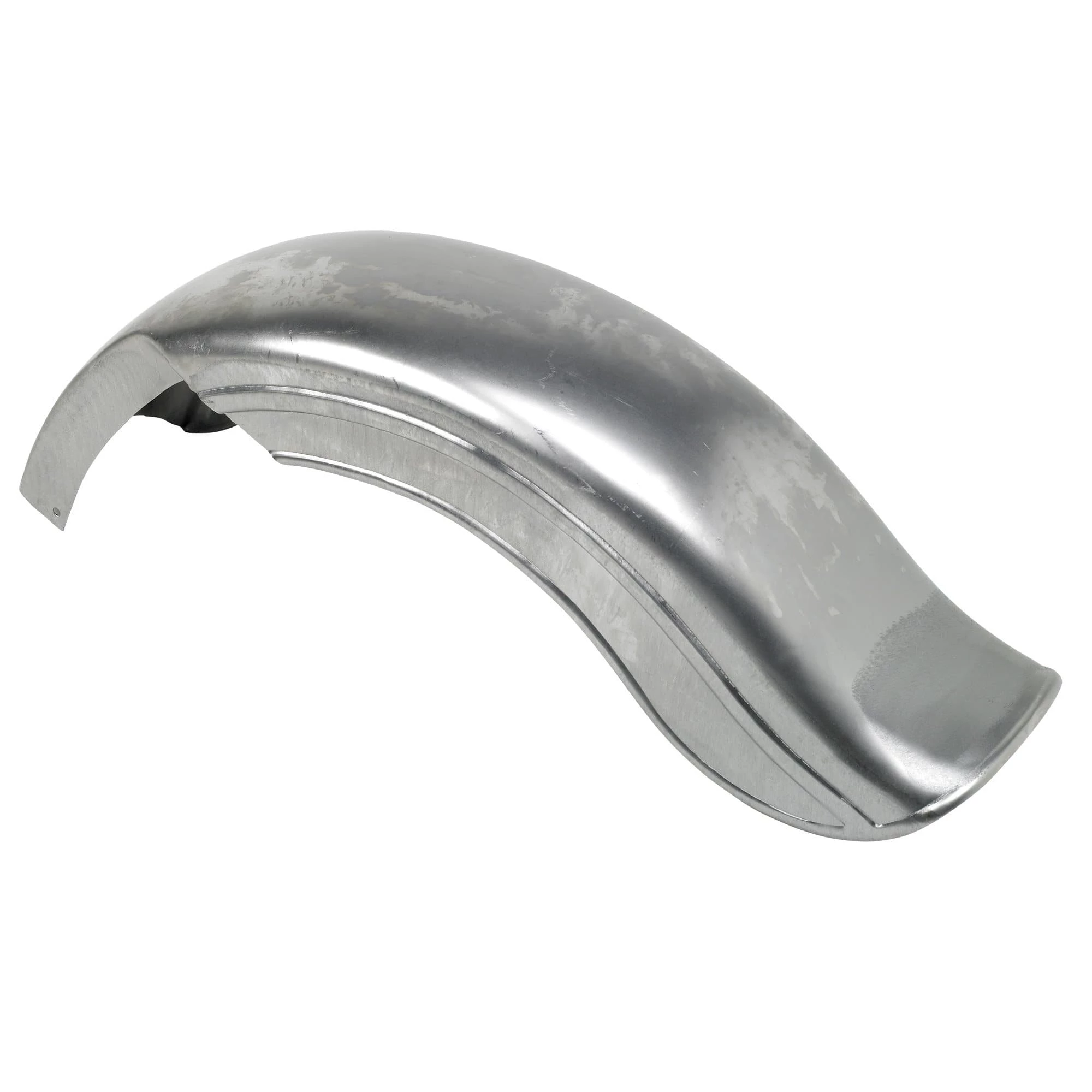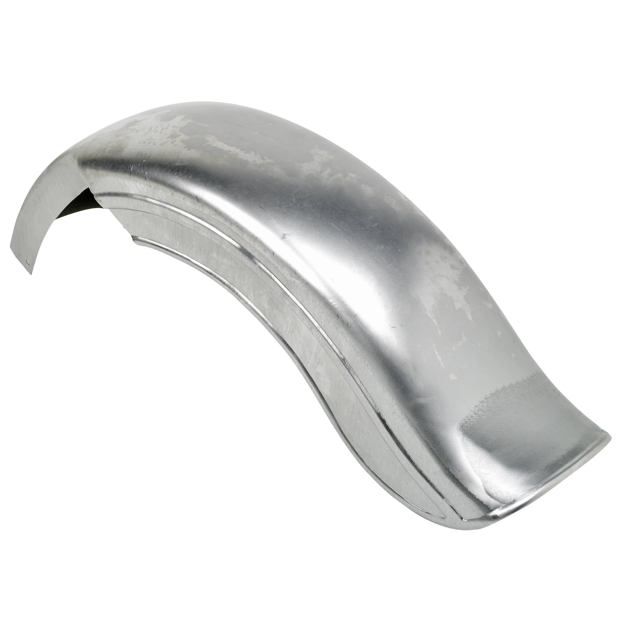 These bare steel fat bob fenders have a chain relief on the left side and can be run on any left side drive motorcycle like Triumphs, Yamaha XS650, Harley Davidsons, etc. These are really sturdy, heavy duty fenders. Run the whole thing or modify it, section and narrow it, use only the end ‘flip’ for that bratty look or whatever you want to do. 7″ wide, 28″ measured straight across end to end and 38″ measured along the curve of the fender. These are a proper radius for an 18″ rear rim, or a 16″ rear with a high sidewall vintage style tire. This best selection motorcycle fender features a Left side chain relief (Left side when sitting on the motorcycle facing forward). See related products below for a Right side relief model.
