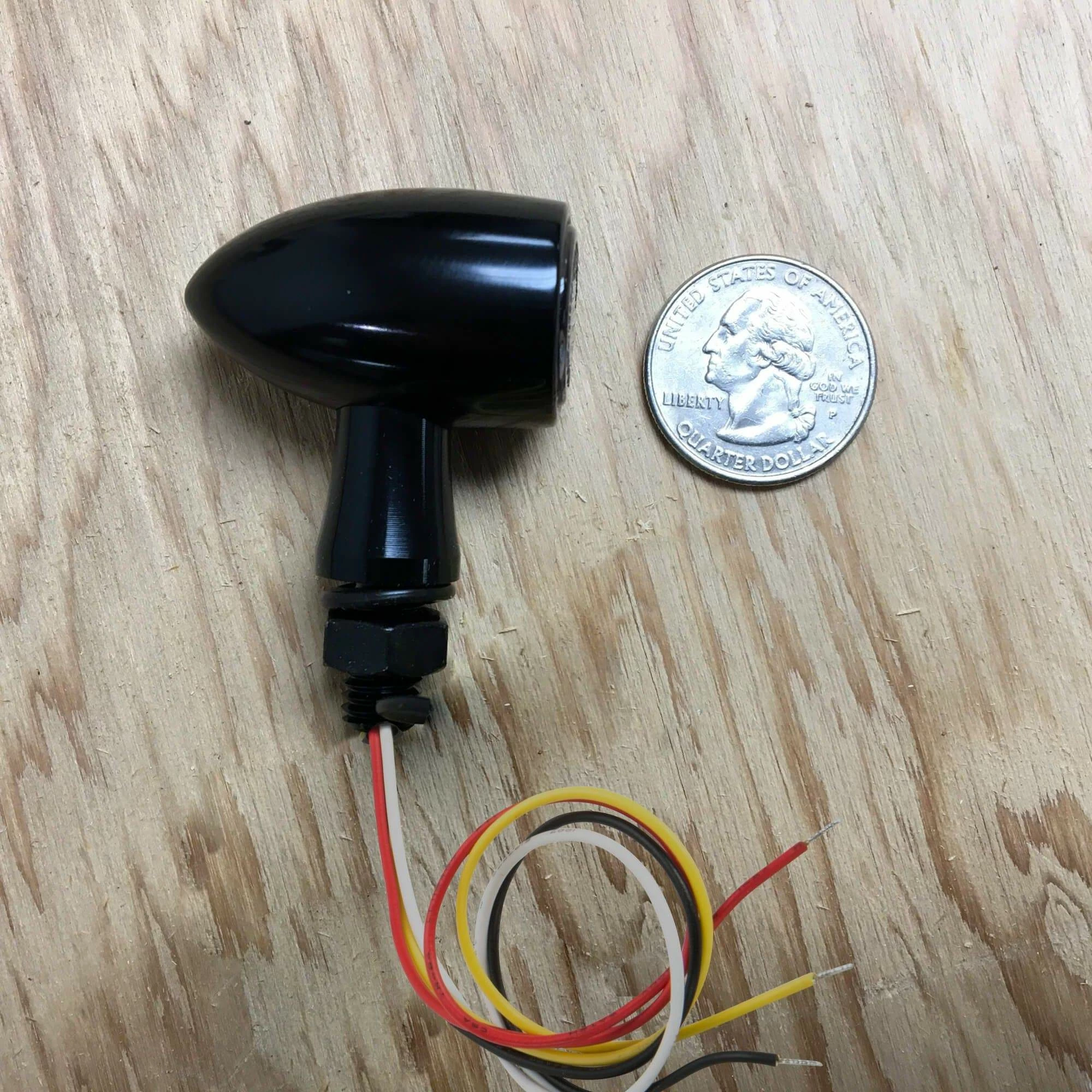 These low profile aluminum bullet motorcycle marker lights feature amber LED lights as well as red LED lights so these can double as marker/turn signals as well as running/brake lights with a load equalizer. The 8mm threaded post is .60″ long and can not be removed. These motorcycle tail lights are sold in pairs.