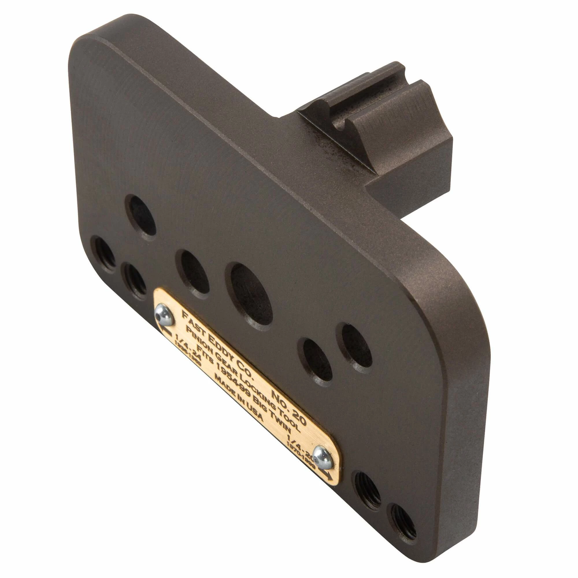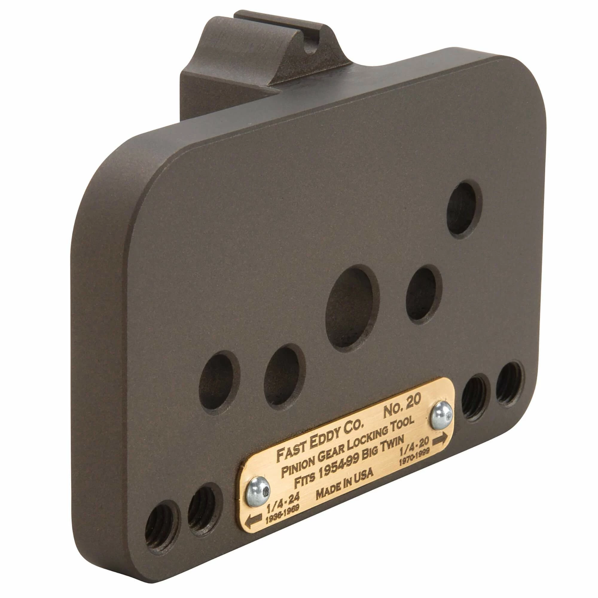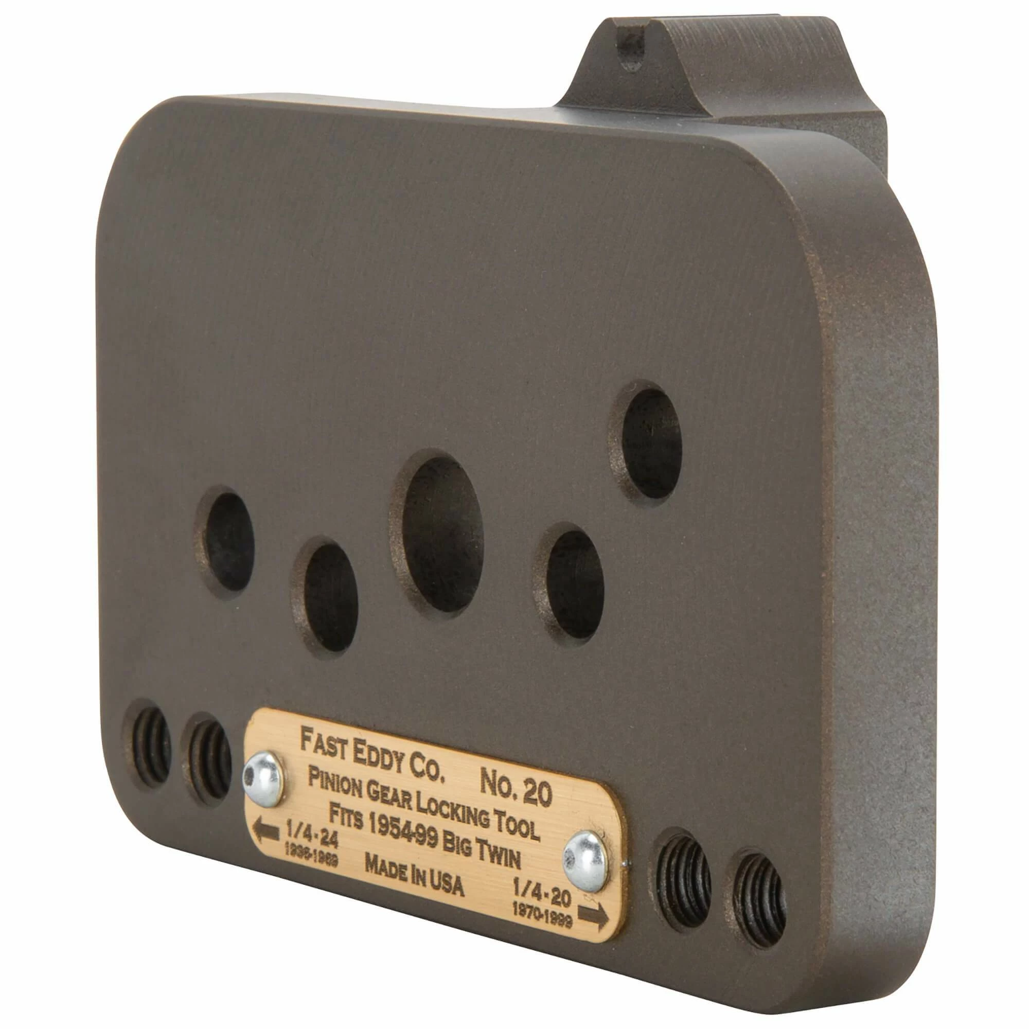 This tool locks your pinion gear in place so you can hold pinion nut properly. It is made out of tool steel and is heat treated to last several lifetimes. Fits all 1954-99 Harley Big Twins. Makes it much easier to tighten the pinion nut, and enables you to apply an accurate, factory-specified torque. Includes tapped holes to store the 1/4-20 and 1/4-24 screws that you use to mount the tool. To make life easy Fast Eddy Co. also has a Pinion Nut Socket that fits 1954-1992 Big Twins to help remove and re-install that pesky nut.