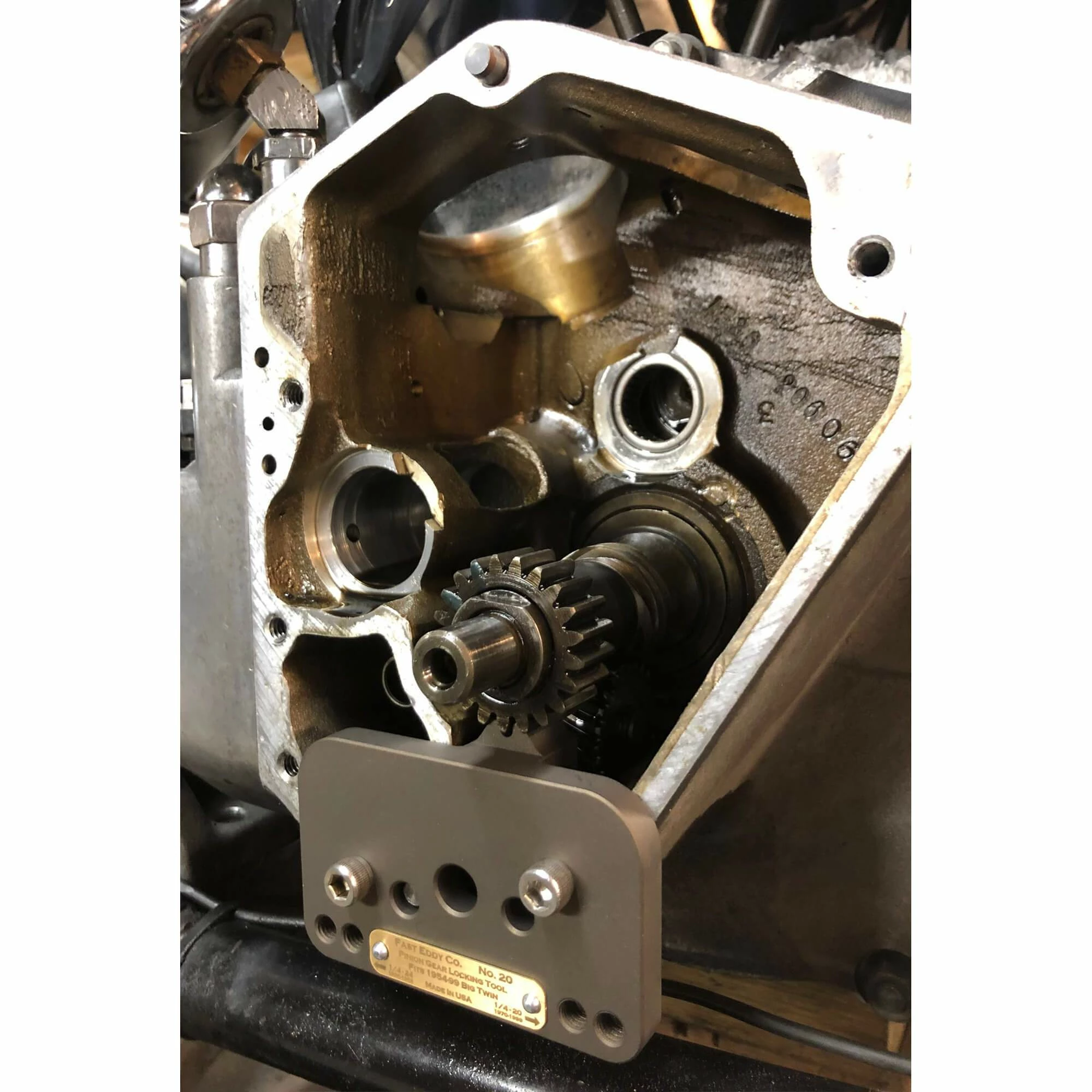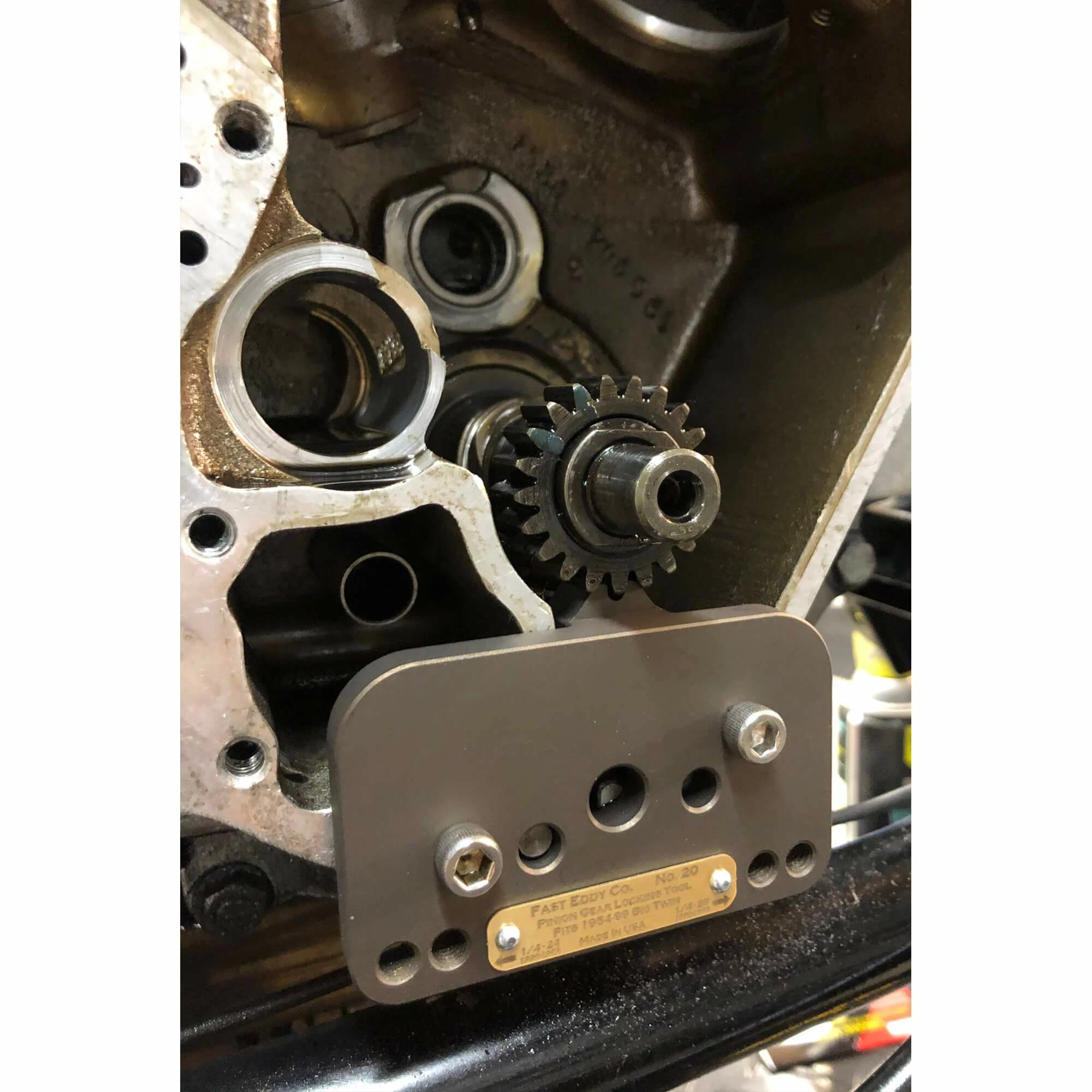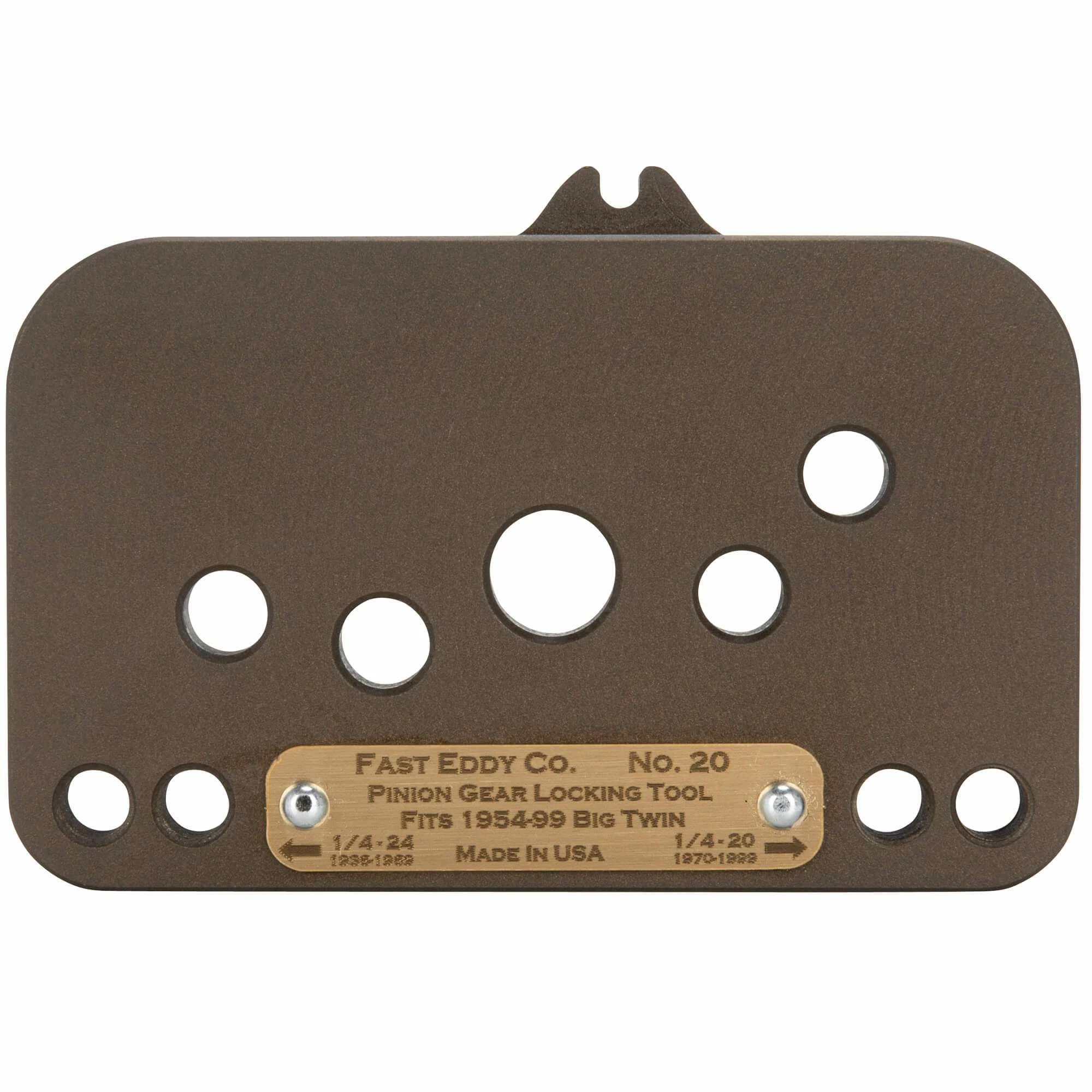 This tool locks your pinion gear in place so you can hold pinion nut properly. It is made out of tool steel and is heat treated to last several lifetimes. Fits all 1954-99 Harley Big Twins. Makes it much easier to tighten the pinion nut, and enables you to apply an accurate, factory-specified torque. Includes tapped holes to store the 1/4-20 and 1/4-24 screws that you use to mount the tool. To make life easy Fast Eddy Co. also has a Pinion Nut Socket that fits 1954-1992 Big Twins to help remove and re-install that pesky nut.