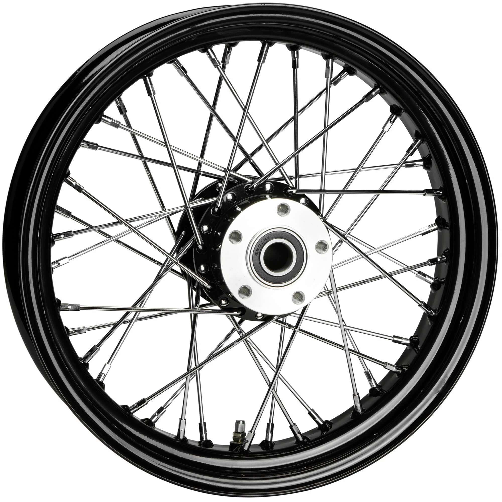 HardDrive Gloss Black and Chrome Spoked wheels are laced in a standard 40-Spoke pattern. Wheels come complete with spoke sealant, Chrome valve stem, inner sleeve and sealed wheel bearings (except the `84-99 fitment which comes with ¾” Timken bearings with an outer seal installed – greasing is required)