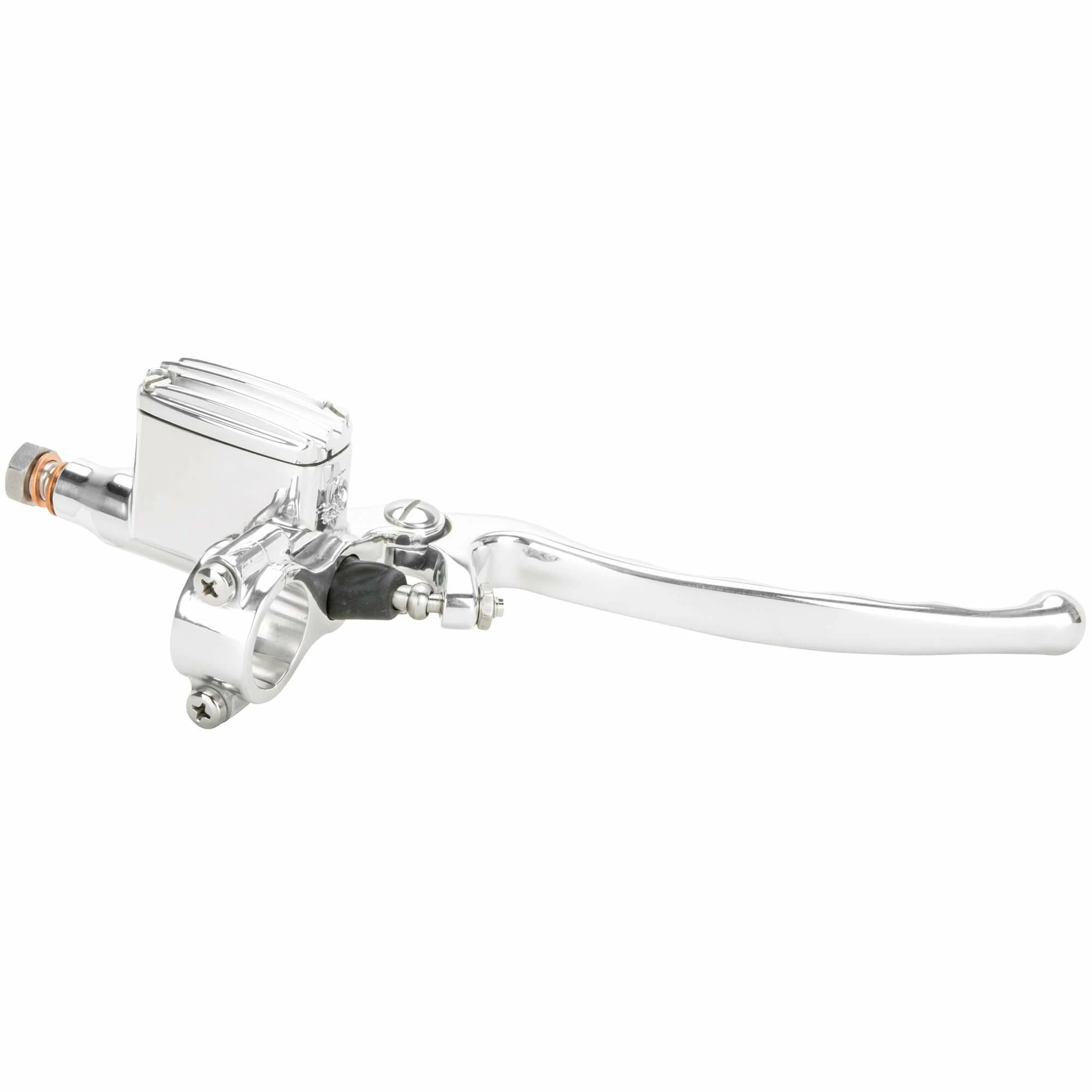 Featuring a forged aluminum body, the Seventies line master cylinder by KustomTech in Italy comes in a polished aluminum body, lever, and cover held in place with two screws. The compact size and lever designed to fit your hand perfectly will give a very retro-style look for all custom projects. It fits all 1″ handlebars and has a 14 mm bore size. For use with DOT 4 or DOT 5 brake fluid. The included banjo bolt is 10mm x 1.00.