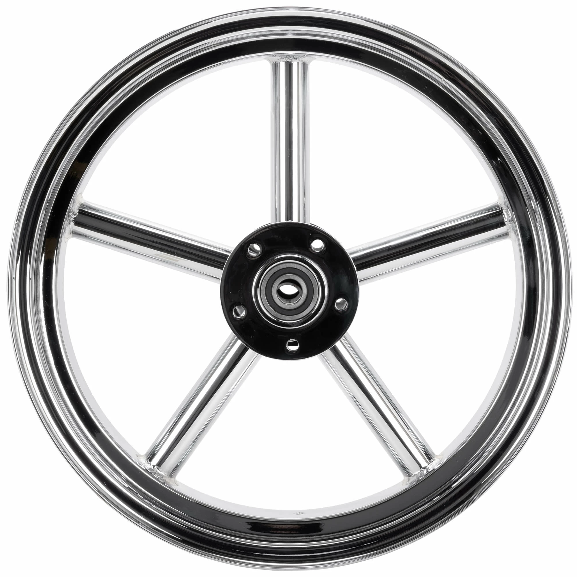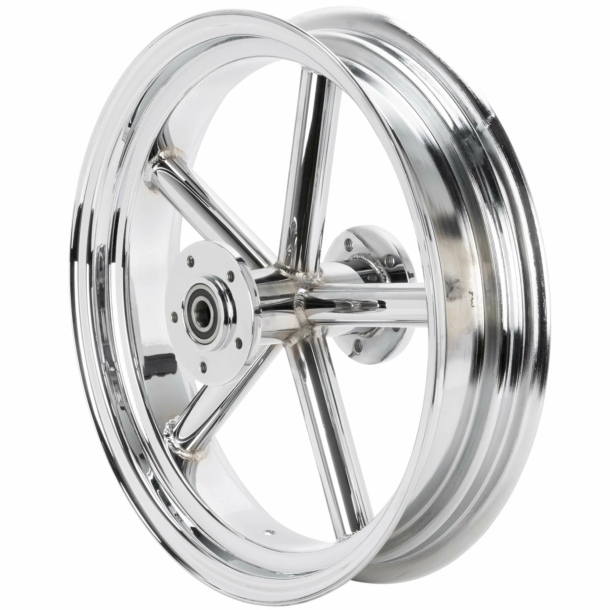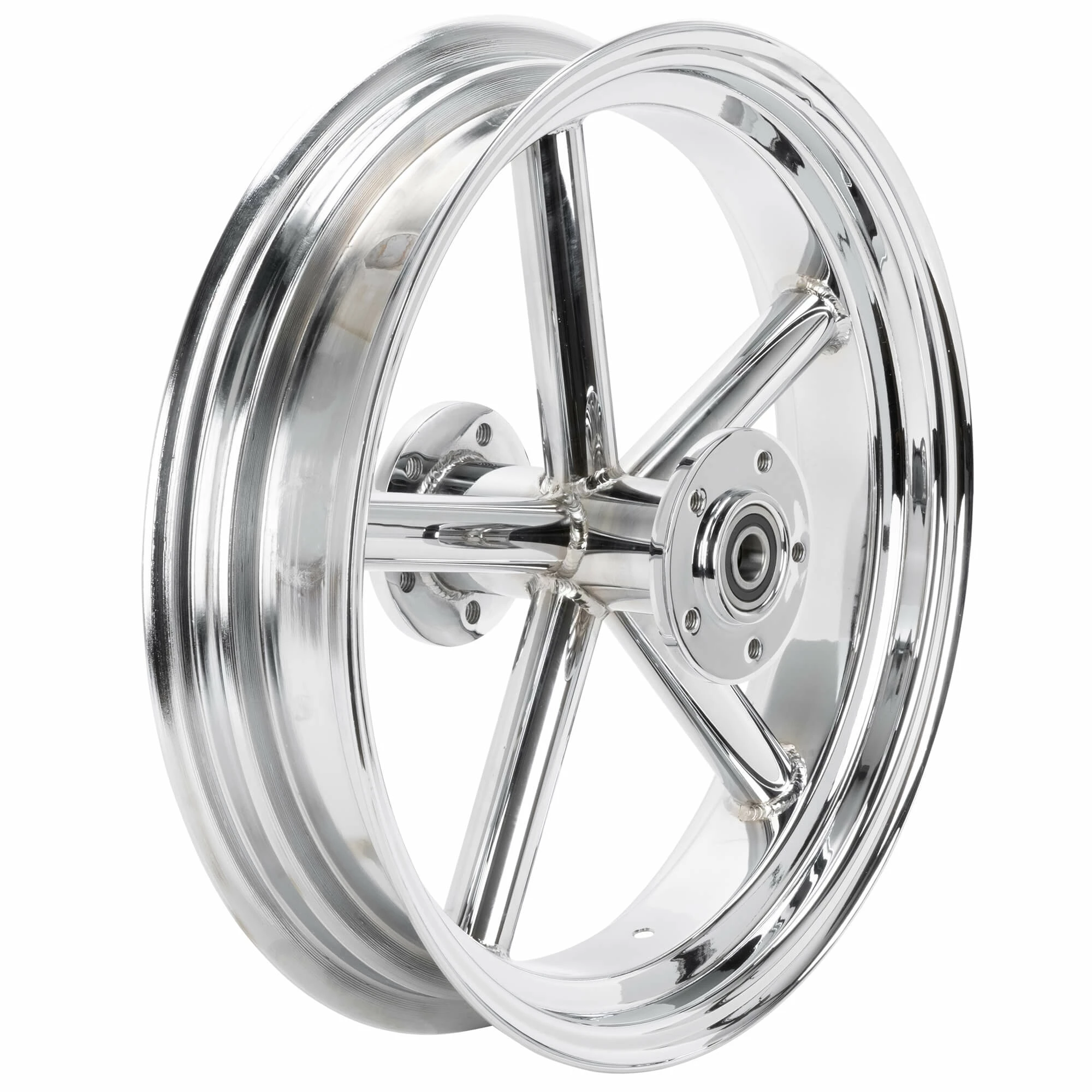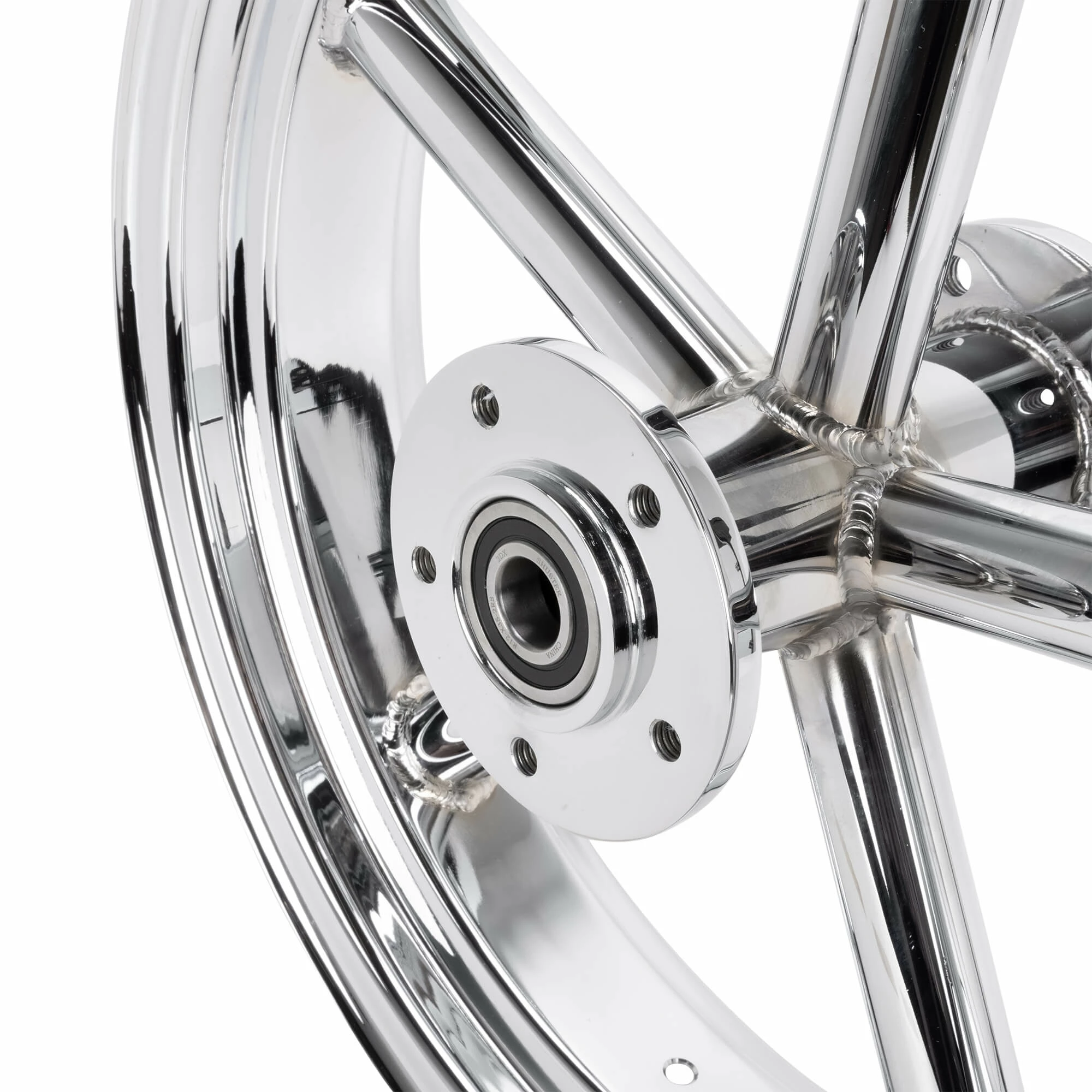 Nothing screams chopper like Invader wheels! However finding a set of originals in decent condition is a tall order, and you still need to worry about metal fatigue and other unseen issues. With that in mind Led Sled Customs started manufacturing their own brand new Invader wheels! This dual flange rear wheel is offered in a Chrome finish, featuring bearings for a 3/4″ axle included. The hub is designed to accept a sprocket and brake disc with 2.2″ center hole, the mounting holes on the flanges measure 7/16″ x 14 on one side, and 3/8″ x 16 on the other.