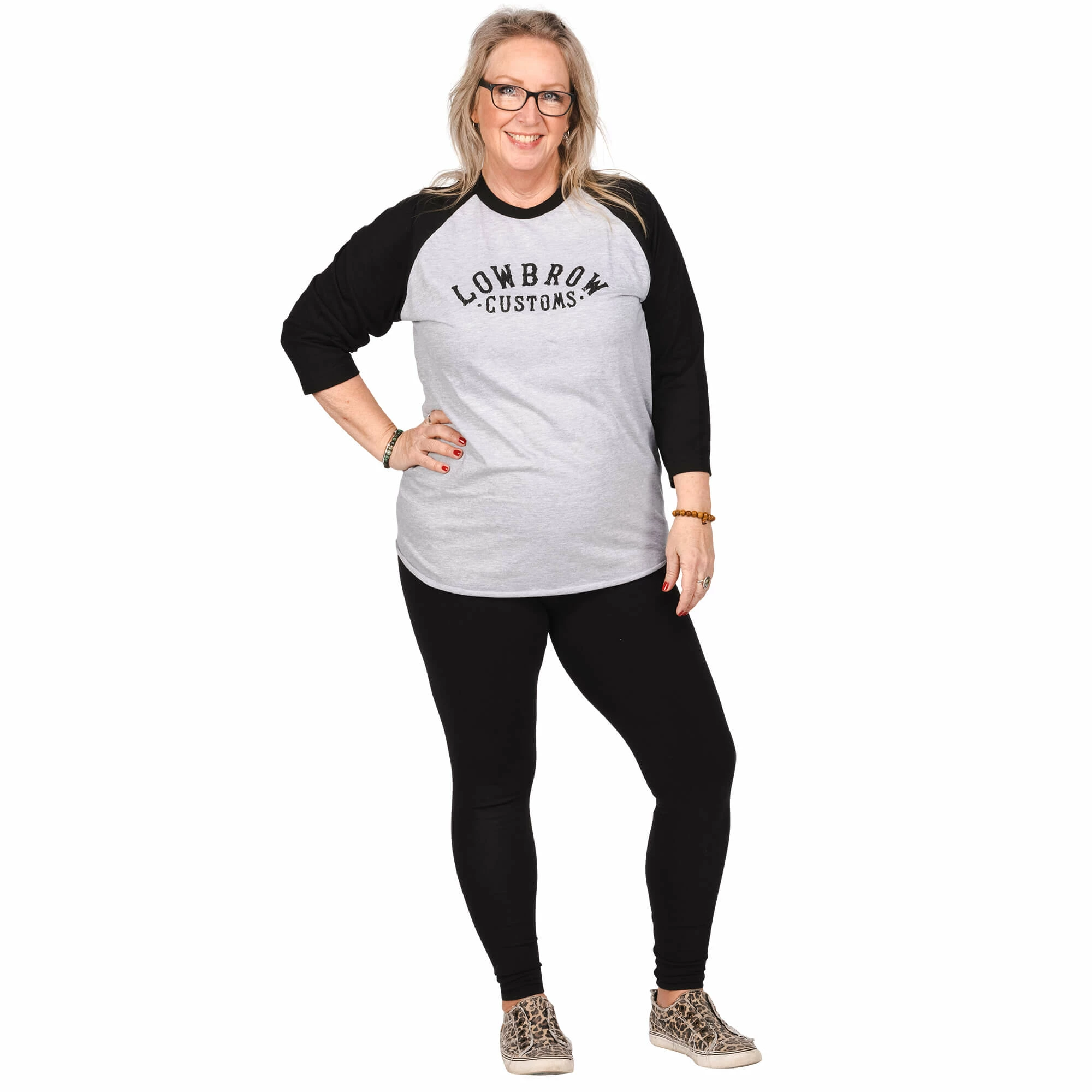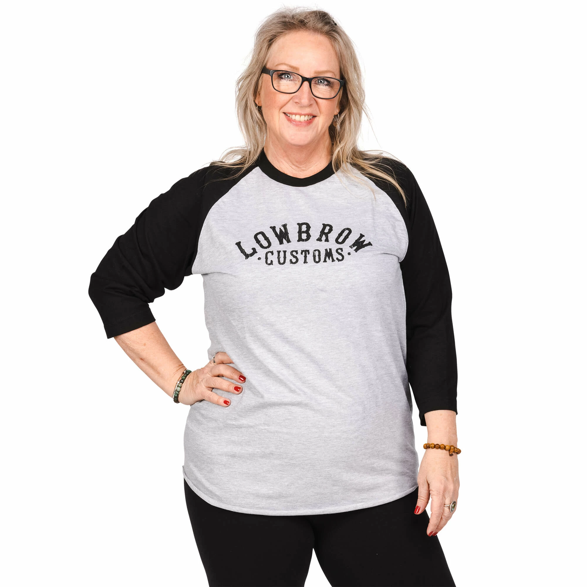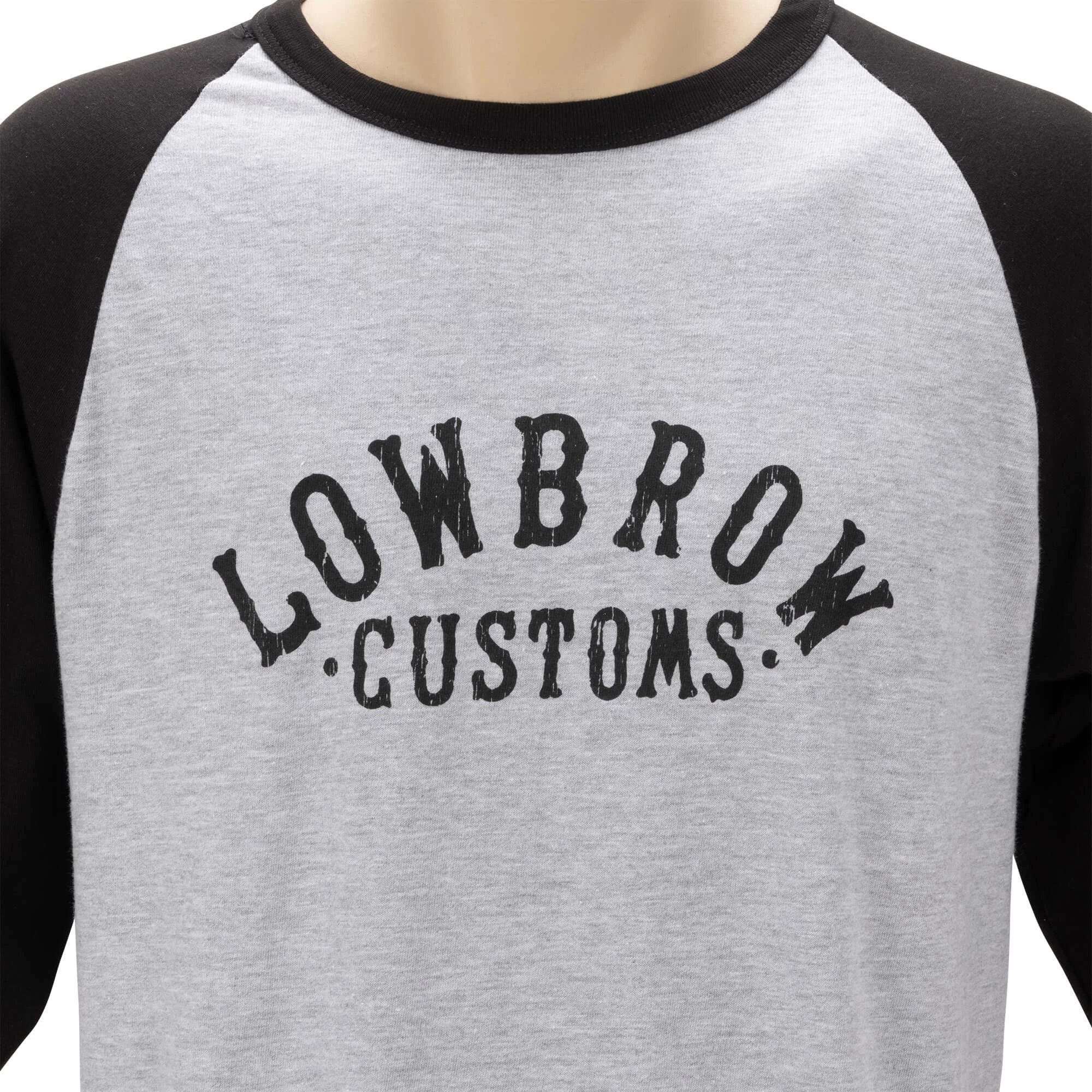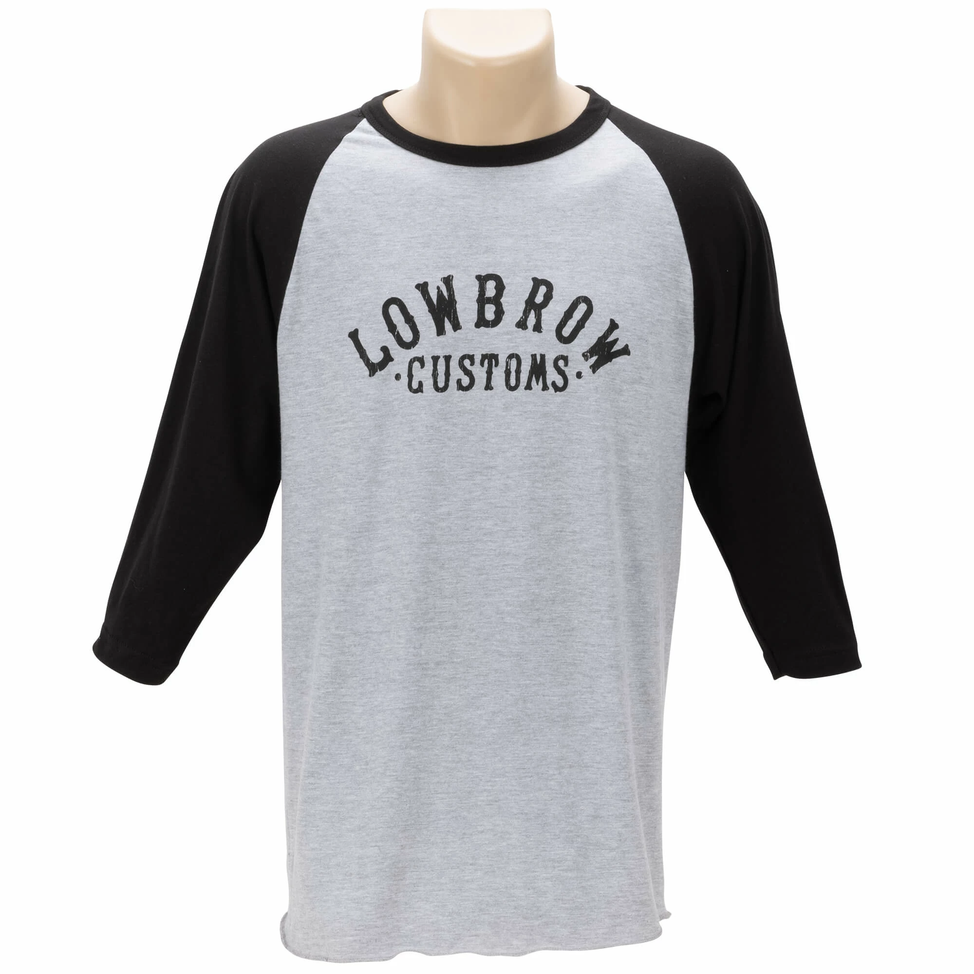The Arched Logo Raglan T-Shirt is a 100% pre-shrunk grey and black cotton raglan. Features a full front imprint of the arched Lowbrow Customs logo.