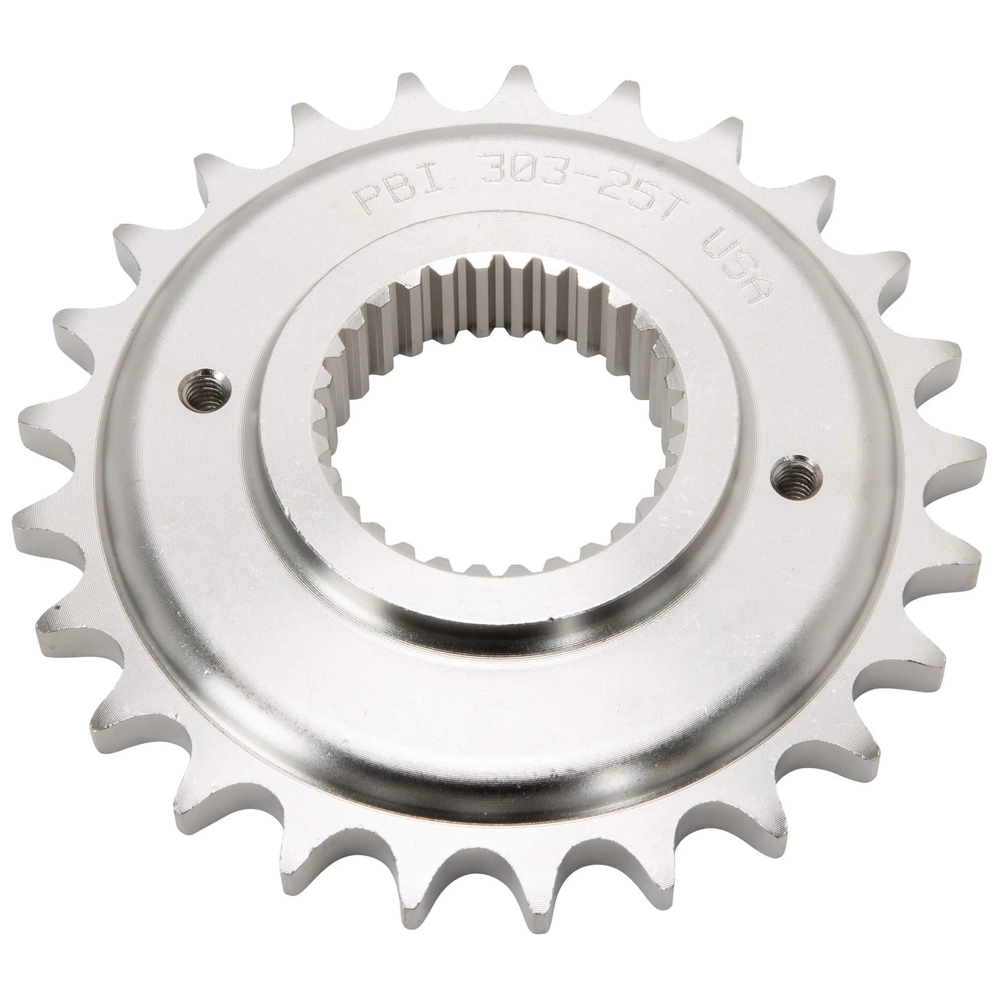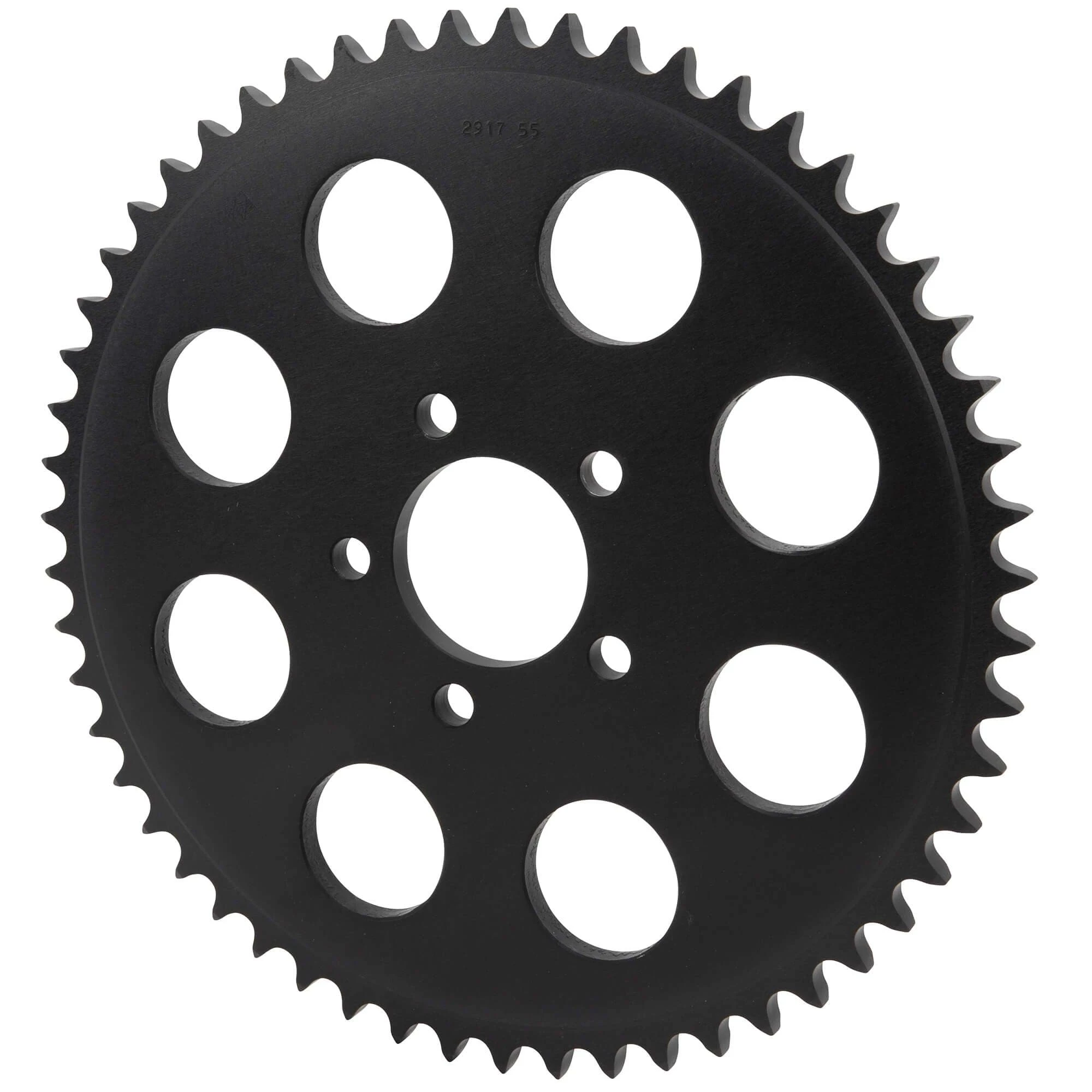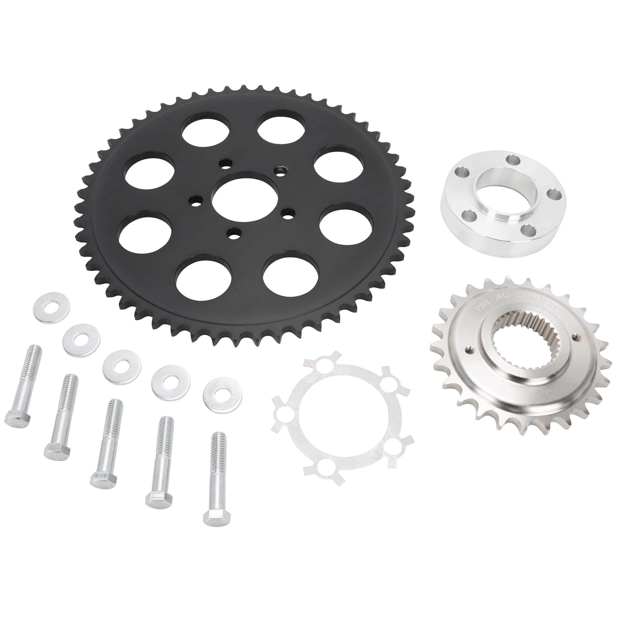 This kit is designed to match stock gearing for 2006-2017 Dynas. The countershaft (front) sprocket is 25 teeth, and the rear sprocket is 55 teeth, for a 2.214:1 gearing ratio. This means that the countershaft sprocket rotates 2.214 times to spin the rear sprocket one full revolution. The less times the countershaft sprocket has to rotate, the taller the gearing, meaning less power off the line but better high-speed cruising. The rear sprocket has a 2.214 inch diameter center hole to properly fit 2006-2017 H-D Dyna rear wheels.