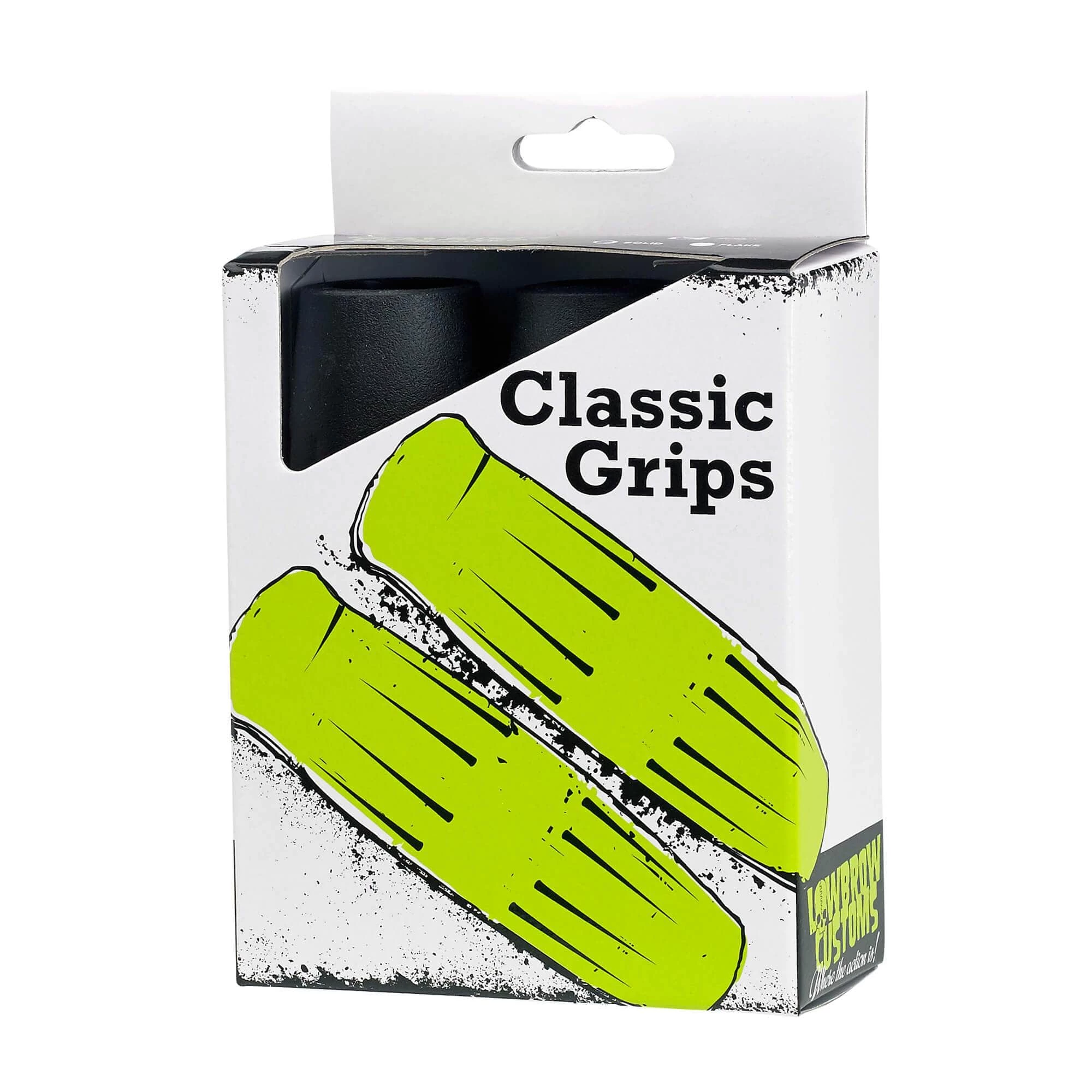 Black, for 1 inch handlebars. As the name implies, Classic Grips from Lowbrow Customs are a timeless design that look at home on vintage and modern motorcycles alike, be it a chopper, bobber, cafe racer or any other fringe of the motorcycle scene. Styled after vintage Harley-Davidson coke bottle grips that were made for stock internal throttles but updated to fit modern motorcycles. This comfortable, radiused grip made out of Krayton rubber is available in several popular colors and is sold per pair. It is important to choose the proper size grips for your motorcycle. Grips are available in 1 inch (the size needed for all Harley-Davidsons and other ‘cruiser’ style motorcycles) as well as 7/8 inch (common on many vintage British, European and Japanese motorcycles such as Triumph, Honda and Yamaha). Please note that any pair of motorcycle grips has two different inside diameters. The grip for the left side (as if you were sitting on the bike) of the handlebar has a smaller diameter, and the right side grip has a larger inside diameter to fit over your throttle tube. Grips are manufactured to have a tight fit, you don’t want one sliding off while taking a corner or twisting the throttle! They are easy to install using a bit of WD-40 to help get them in place. Alternatively, you can use compressed air as seen in our Basic Motorcycle Grip Info & Install video.