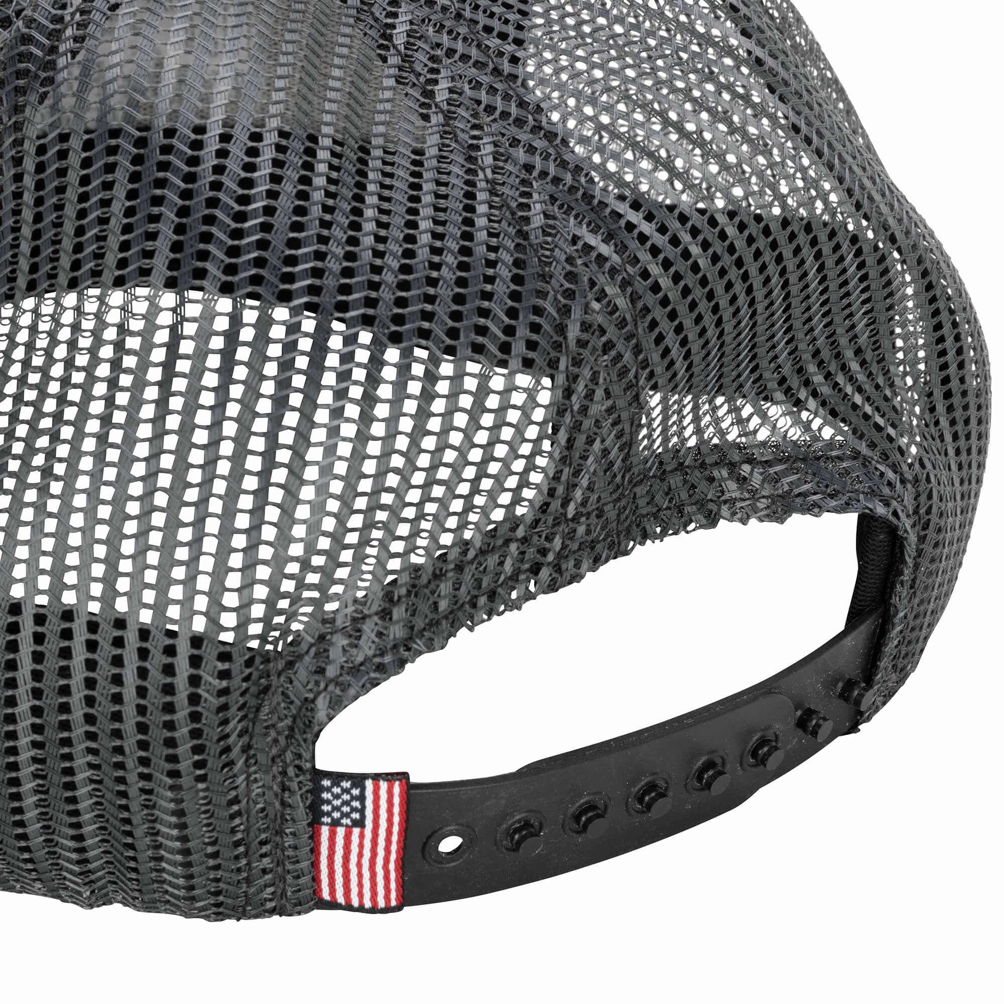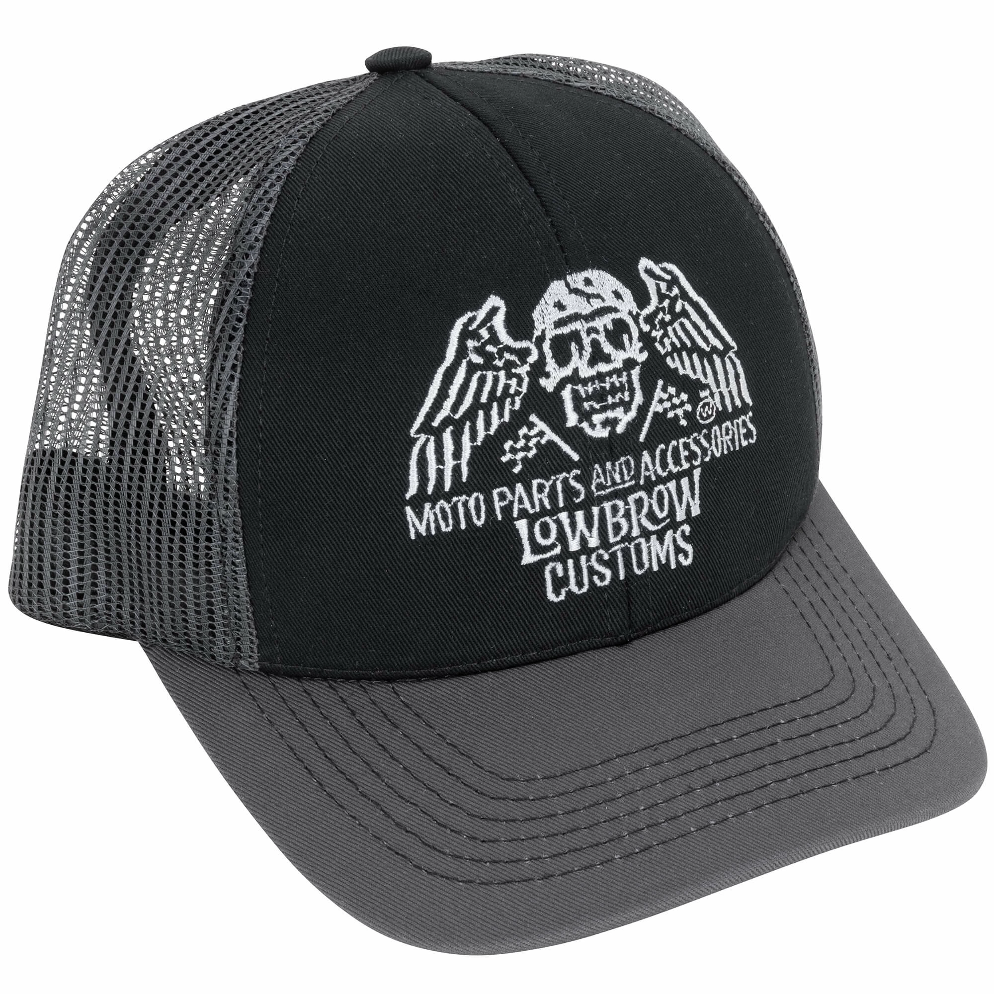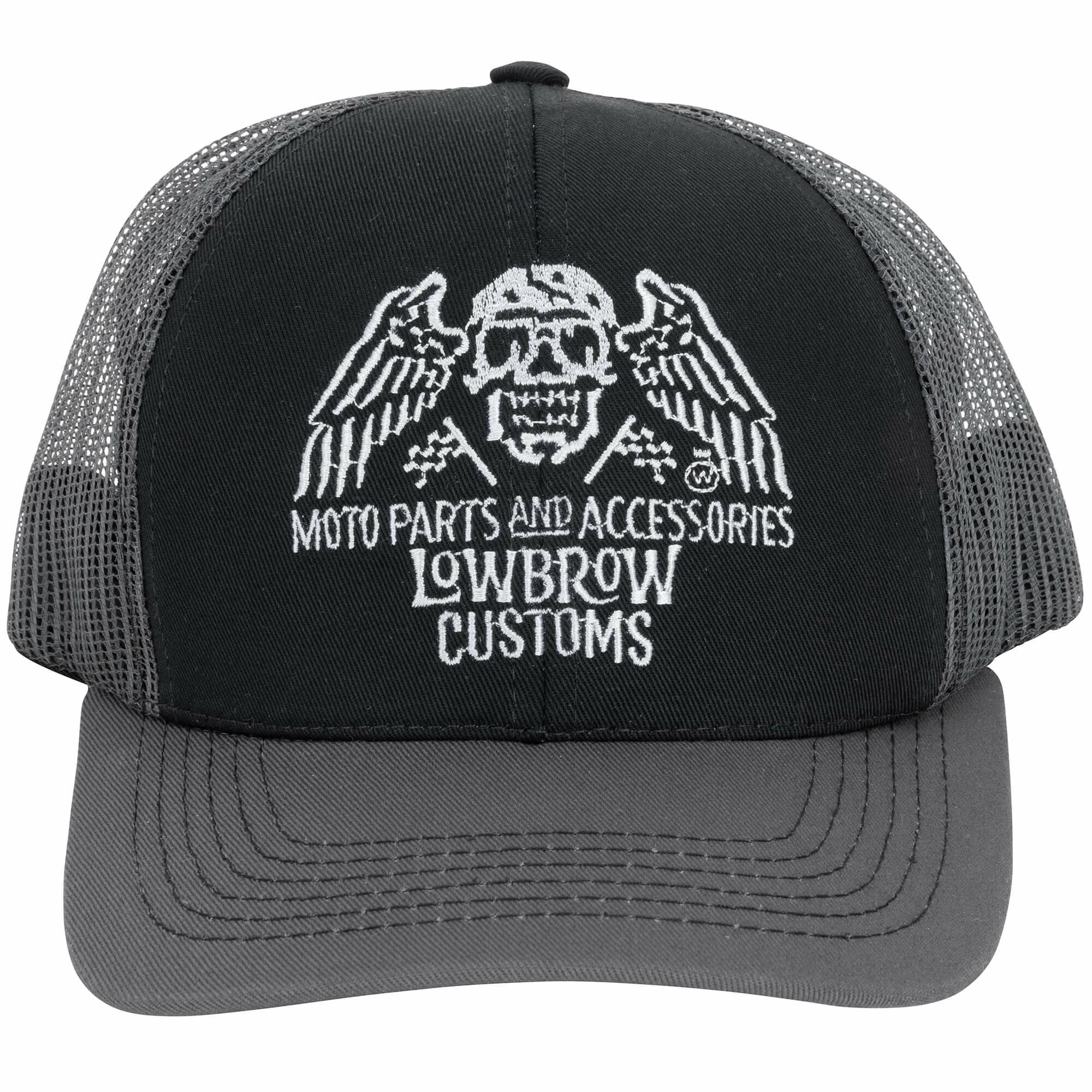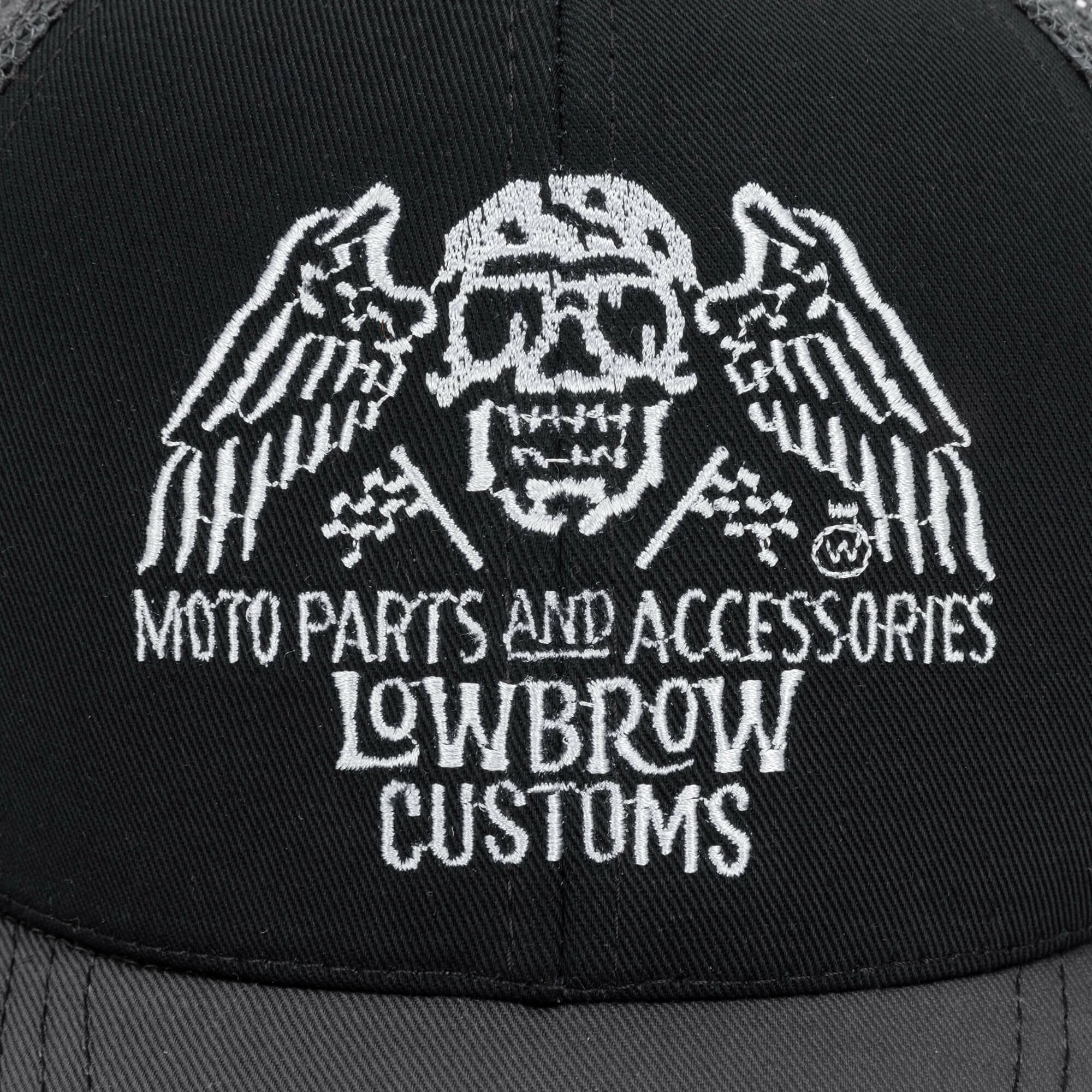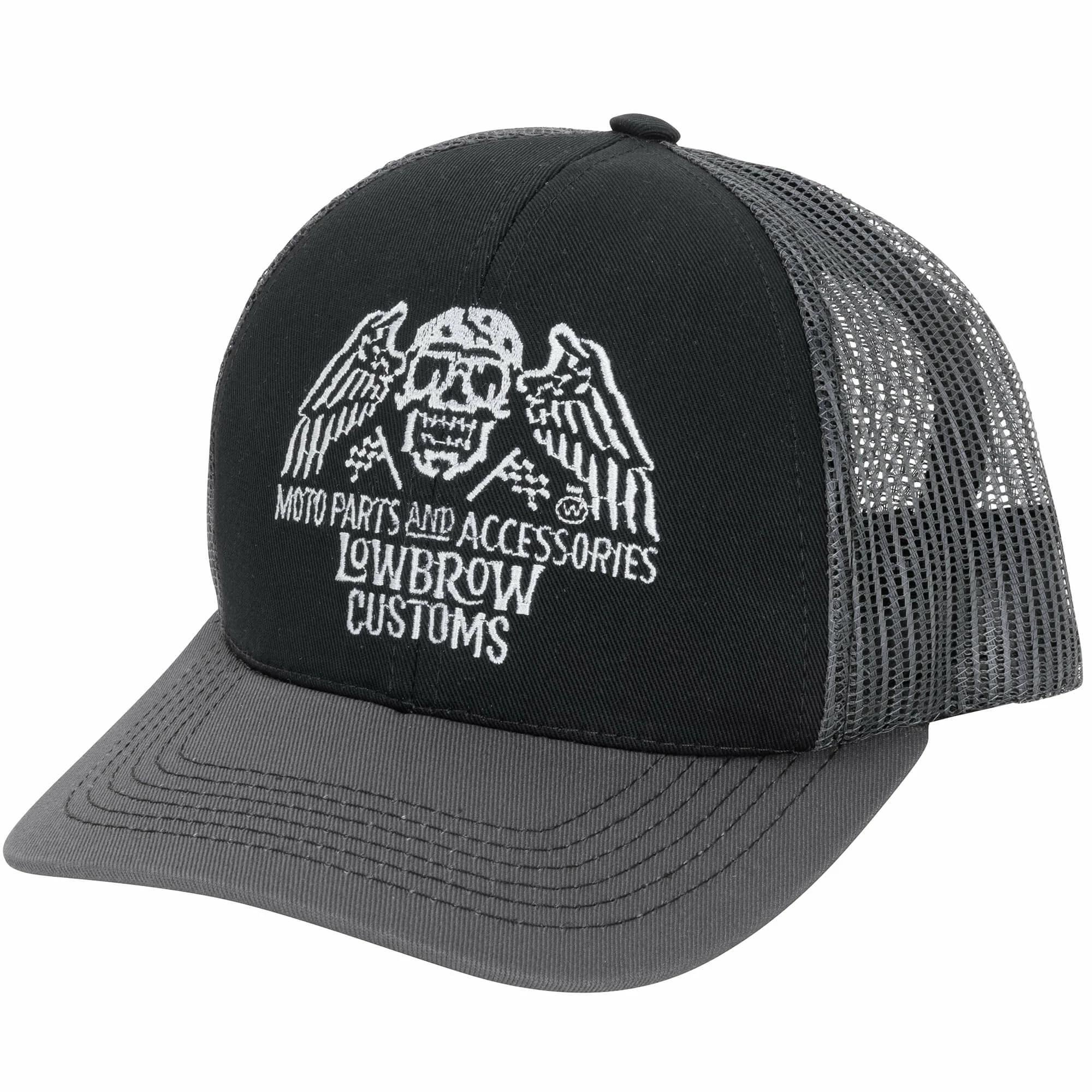 Our mid profile, Lowbrow Flying Skull Hat features a twill material front and a dark grey mesh back for breathability. Black eyelets on a 6 panel American Made hat. Snap-back closure. One size fits most.