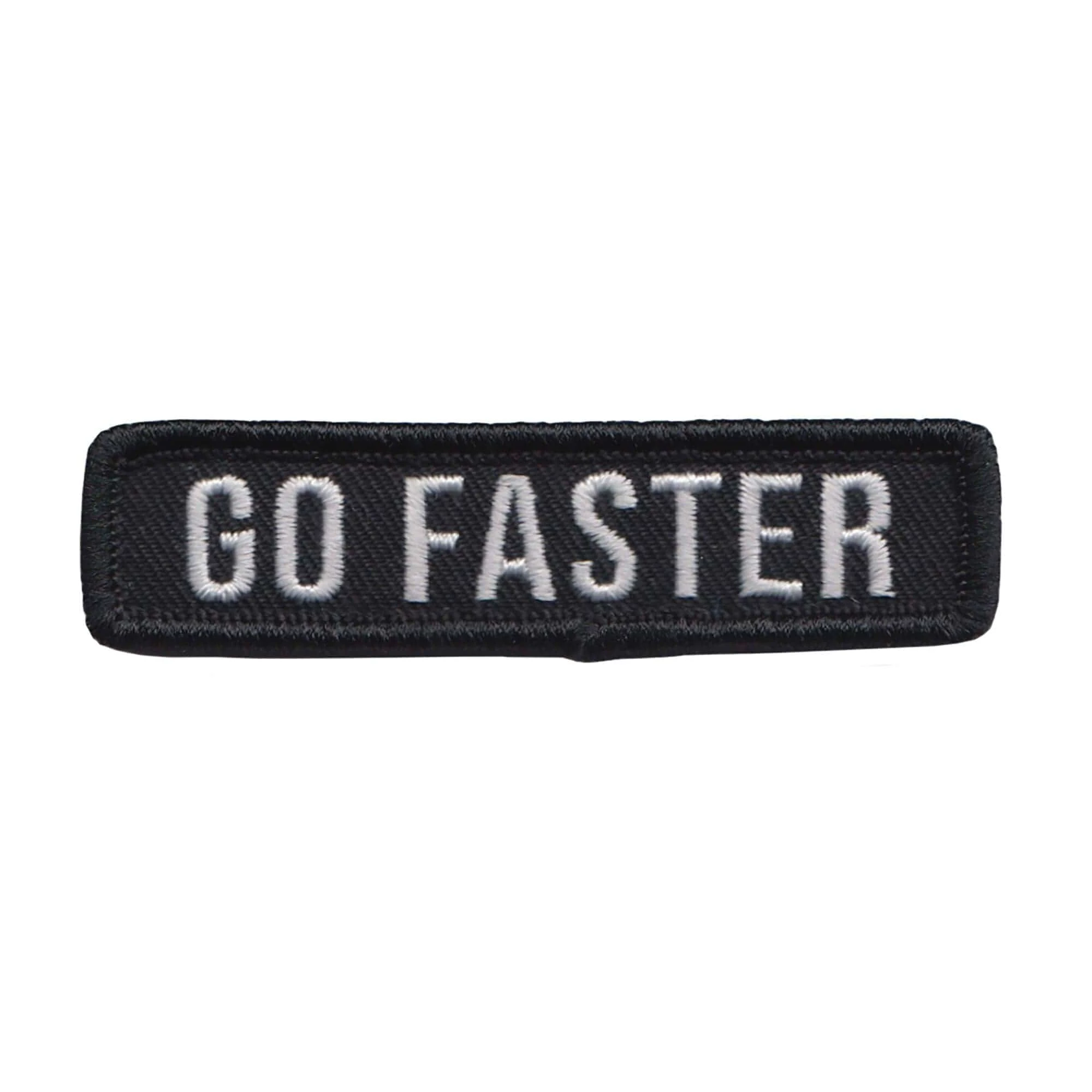 How fast should we go? GO FASTER. This embroidered biker patch features a a heat seal backing. This patch is 3″ wide x 0.5″ high.