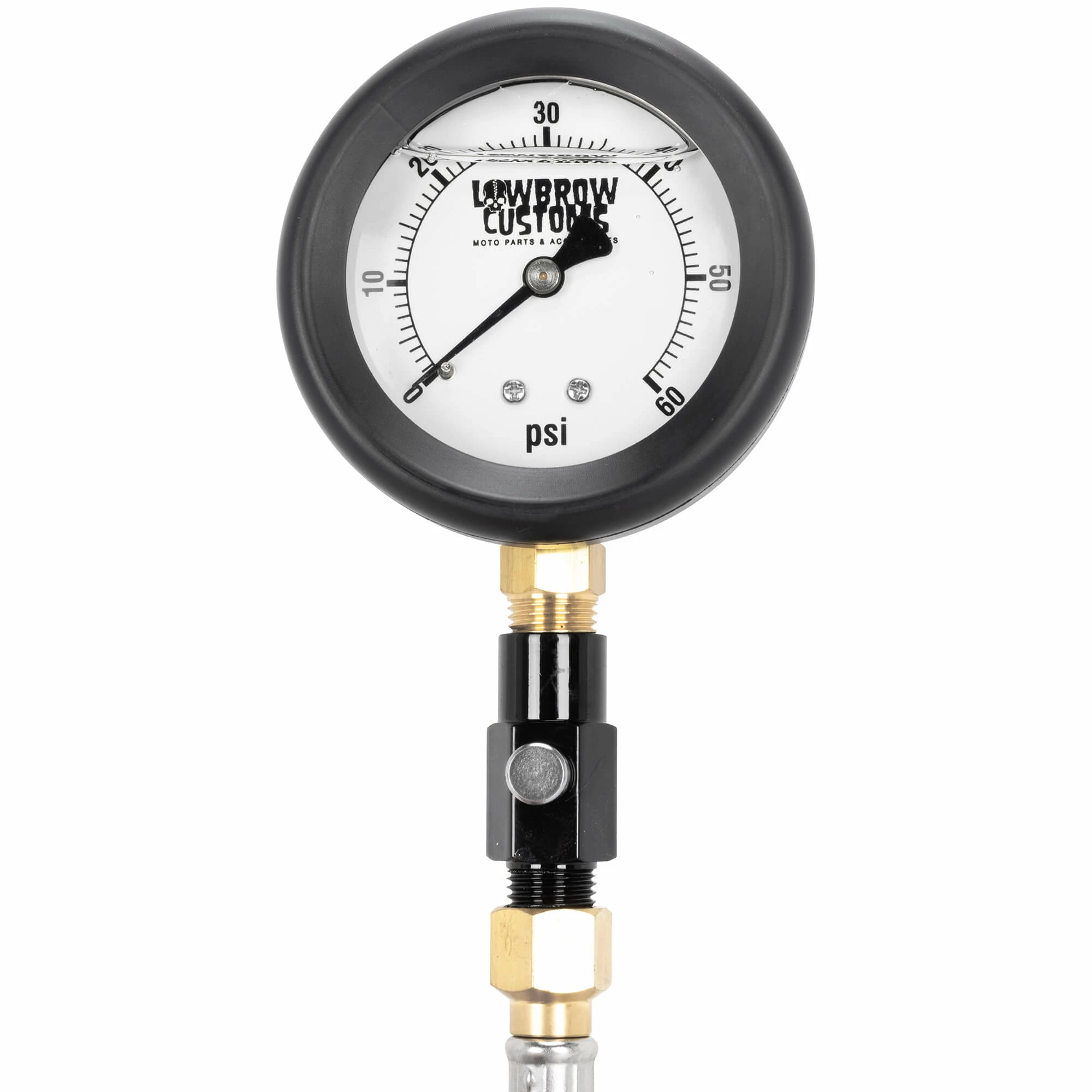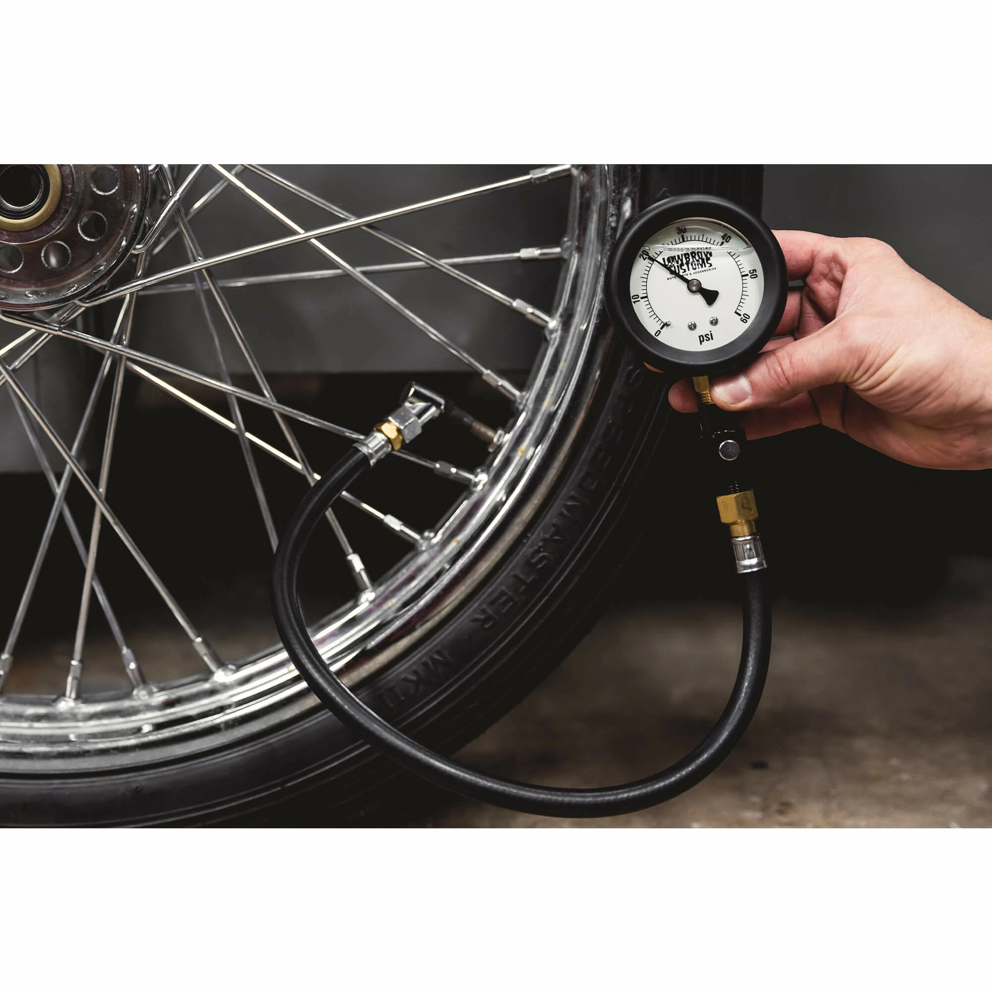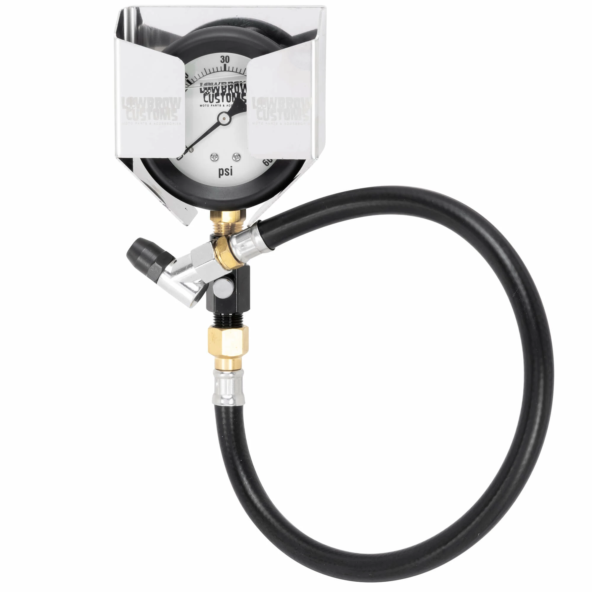 Our Lowbrow Customs Professional 0-60 PSI Tire Gauge is accurate and built to last. This tire gauge has a 2.5” glow-in-the-dark dial that is liquid filled to help support accurate readings. The 17” heavy-duty hose is long enough to reach your tire stem, and the rubber casing protects the steel body from shock. 45° swivel angle chuck ensures easy use and the pressure release valve makes adjustments quick and easy. This is not a cheap gauge. This is a high-quality tool that you will simply love. Comes with a Lowbrow Customs dial and a stainless-steel holder for easy storage.
