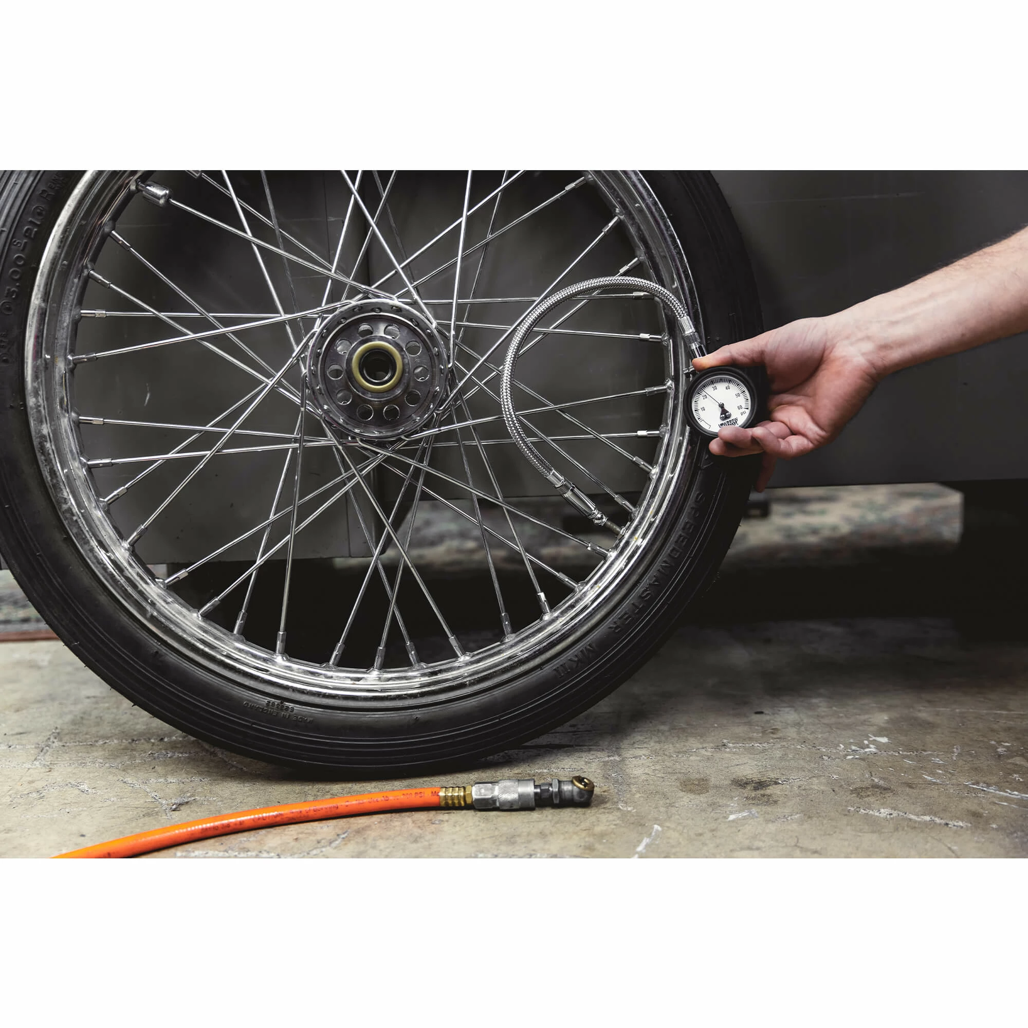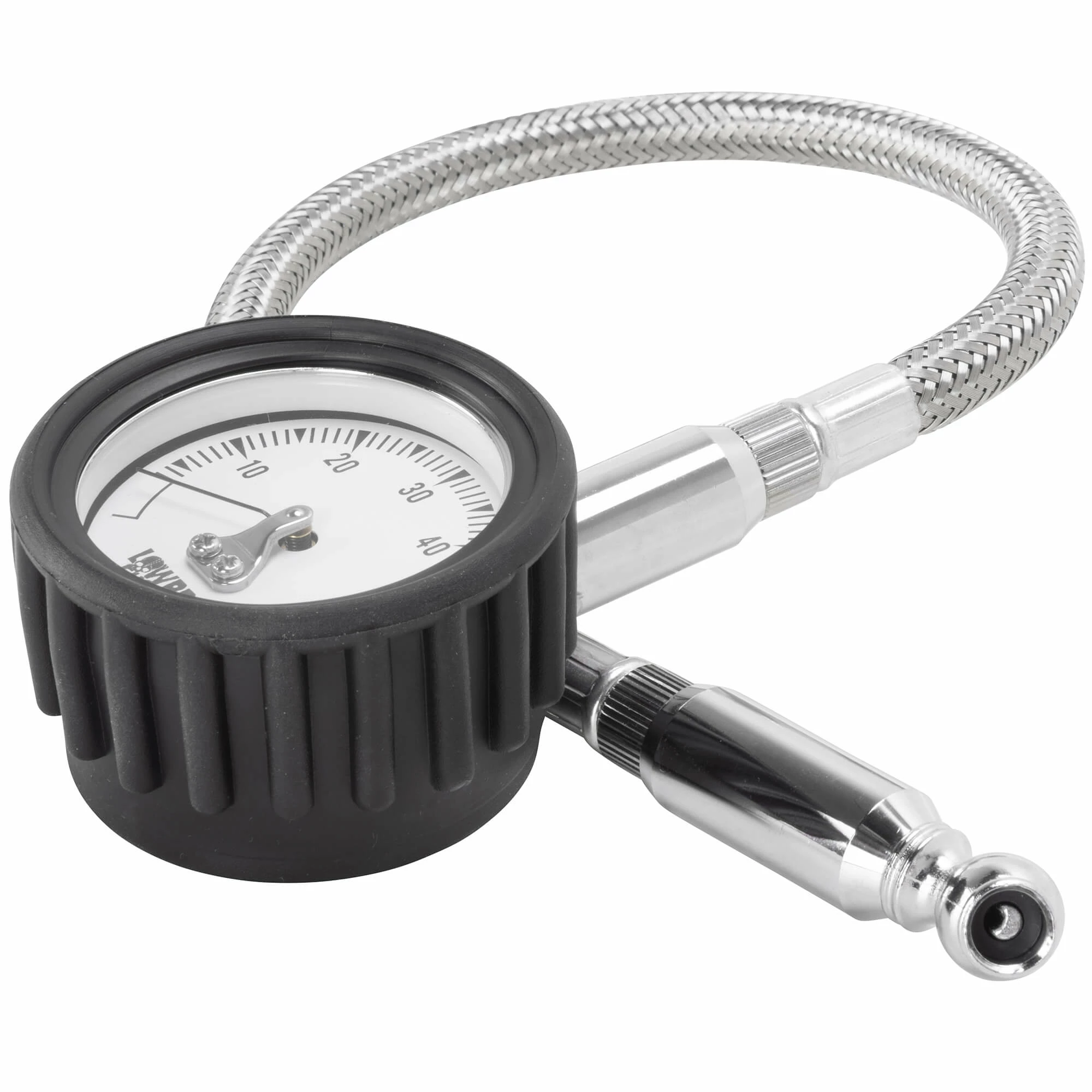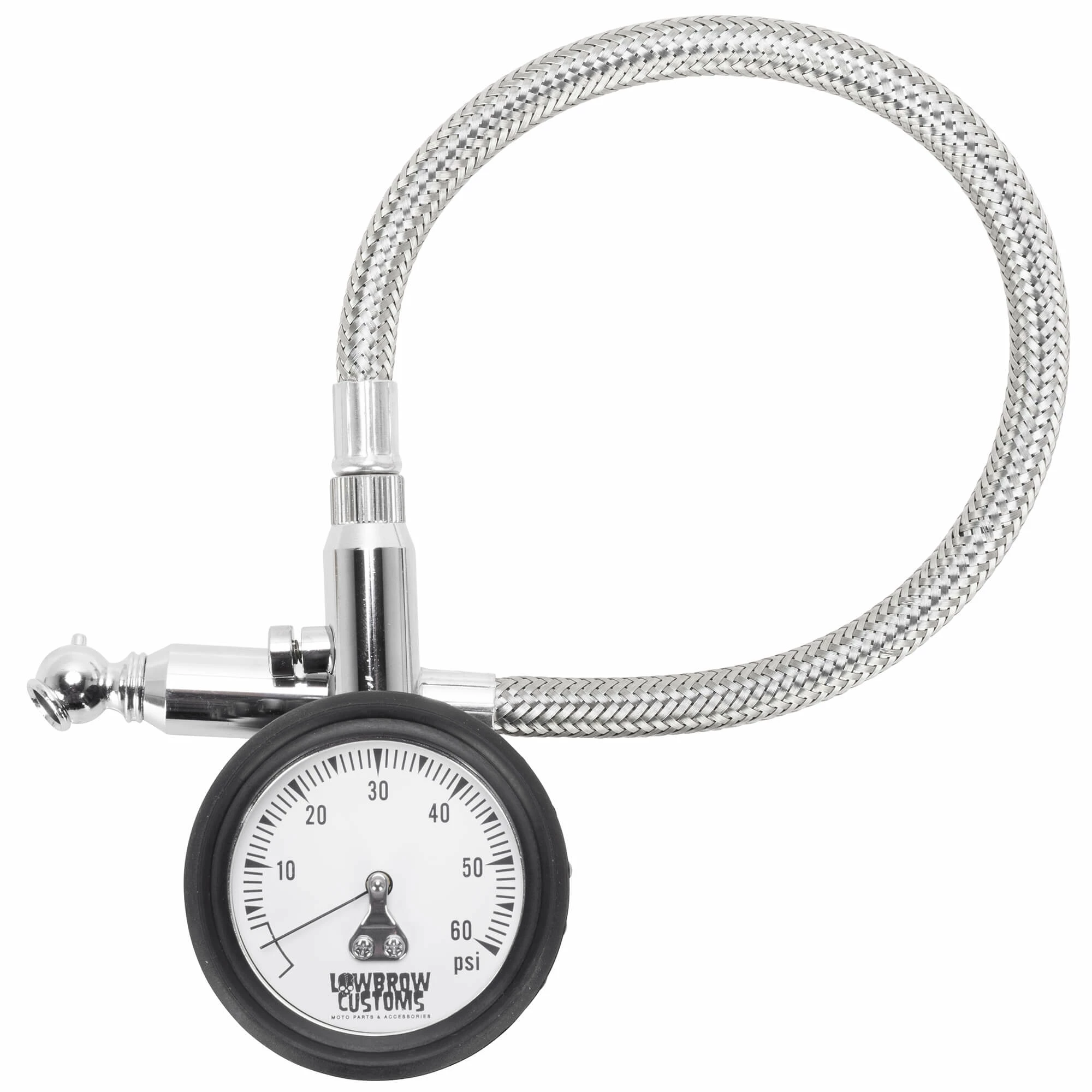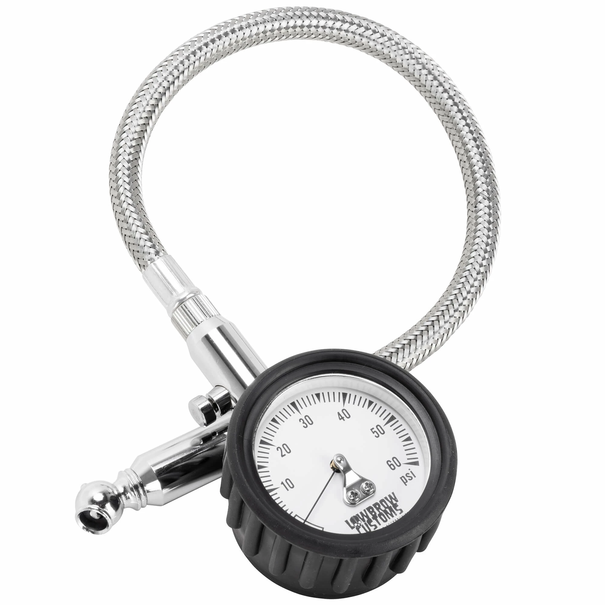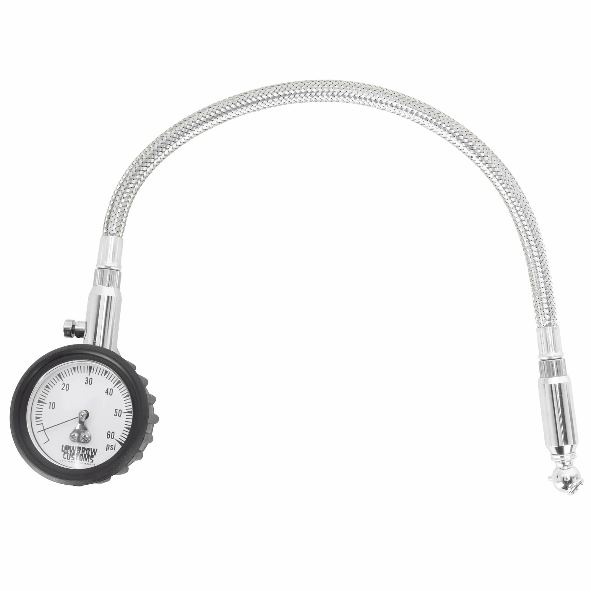 The Lowbrow Customs Tire Gauge has a 2″ gauge face, a 12” stainless-steel braided hose, and a steel body. The 45° angle chuck swivels and will help you get into those tight spots and the rubber casing will help protect the gauge from impact damage. This 0-60 PSI tire pressure gauge also features a push button pressure release valve which makes checking and filling your tires quick and easy.