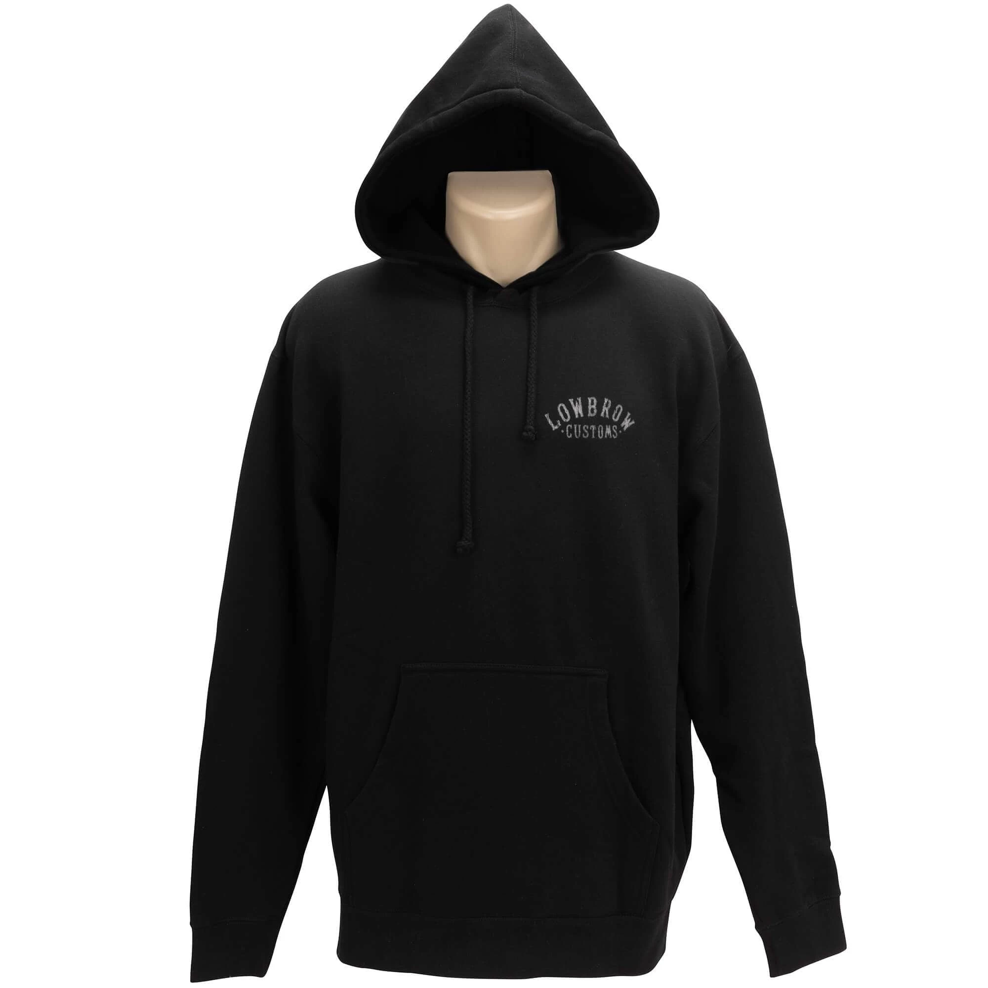 A classic, vintage style design, this winged motorcycle wheel design features a Lowbrow Customs logo left chest and the winged wheel design full back. These premium pullover hooded sweatshirts feature a 10oz. 70% cotton/30% polyester exterior. The fit on these sweatshirts is great, with extra long cuffs, and a heavy gauge flat drawcord.