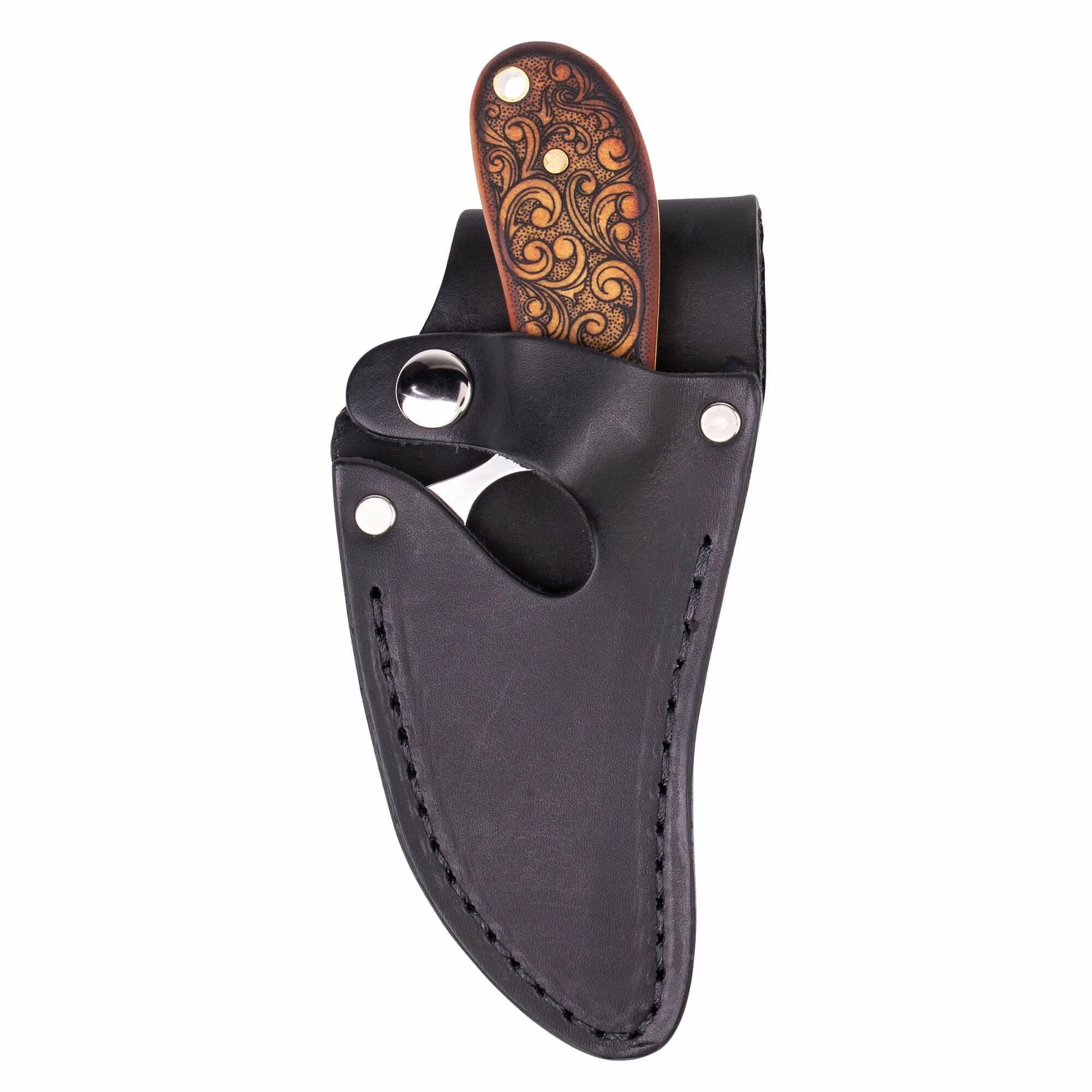 It comes tucked in the Convertible sheath which is a unique 3-in-1 design by Whiteknuckler Brand that’s perfect for long-haul truck drivers, hot rodders, and motorcyclists. It’s a new take on the classic horizontal sheath that allows you to swap between traditional vertical, front horizontal, or cross pull options all with one product for a true 3-in-1 design. Perfect for people that spend long hours in the seated position in or on a vehicle! The beautiful premium rich American leather is complemented by a natural handle. Designed for both function and style, it makes a great everyday piece. Put a classic on your hip or that of someone you love today.
